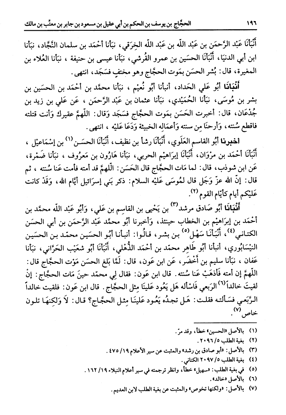 أنبأنا أبو صادق مرشد (3) بن يحيى بن القاسم بن علي وأبو عبد الله محمد بن احمد بن إبراهيم بن الخطاب حينئذ واخبرنا أبو محمد عبد الرحمن بن أبي الحسن الكتاني (4) أنبأنا سهل (5) بن بشر قالوا أنبأنا أبو الحسين محمد بن الحسين النيسابوري أنبأنا أبو طاهر محمد بن احمد الذهلي أنبأنا أبو شعيب الحراني نبأنا عفان نبأنا سليم بن اخضر عن ابن عون قال لما بلغ الحسن موت الحجاج قال اللهم أن امته فأذهب عنا سنته قال ابن عون فقال لي محمد حين مات الحجاج أن لقيت خالدا (6) الربعي فاسأله هل يعود علينا مثل الحجاج قال ابن عون فلقيت خالدا الربعي فسألته فقلت هل تجده يعود علينا مثل الحجاج قال لا ولكنها تلون خاص (7)