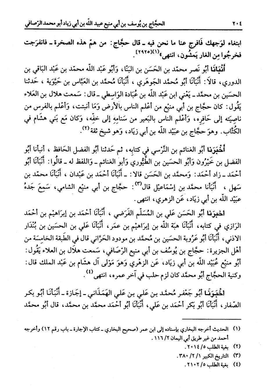 اخبرنا أبو الغنائم بن النرسي في كتابه ثم حدثنا أبو الفضل الحافظ أنبأنا أبو الفضل بن خيرون وأبو الحسين بن الطيوري وأبو الغنائم واللفظ له قالوا أنبأنا أبو احمد زاد احمد ومحمد بن الحسن قالا أنبأنا احمد بن عبدان أنبأنا محمد بن سهل أنبأنا محمد بن إسماعيل قال (3) حجاج بن أبي منيع الشامي سمع جده عبيد الله بن أبي زياد عن الزهري انتهى اخبرنا أبو الحسن علي بن المسلم الفرضي أنبأنا احمد بن إبراهيم بن احمد الرازي في كتابه أنبأنا هبة الله بن إبراهيم بن عمر أنبأنا علي بن الحسين بن بندار الاذني انبأنا أبو عروبة الحسين بن محمد بن مودود الحراني قال في الطبقة الخامسة من أهل الجزيرة حجاج بن يوسف بن أبي منيع الرصافي سمعت هلال بن العلاء يقول أبو منيع عبيد الله بن أبي زياد عن الزهري وهو مولى آل هشام بن عبد الملك قال وكنية الحجاج أبو محمد كان لزم حلب في آخر عمره انتهى (4)