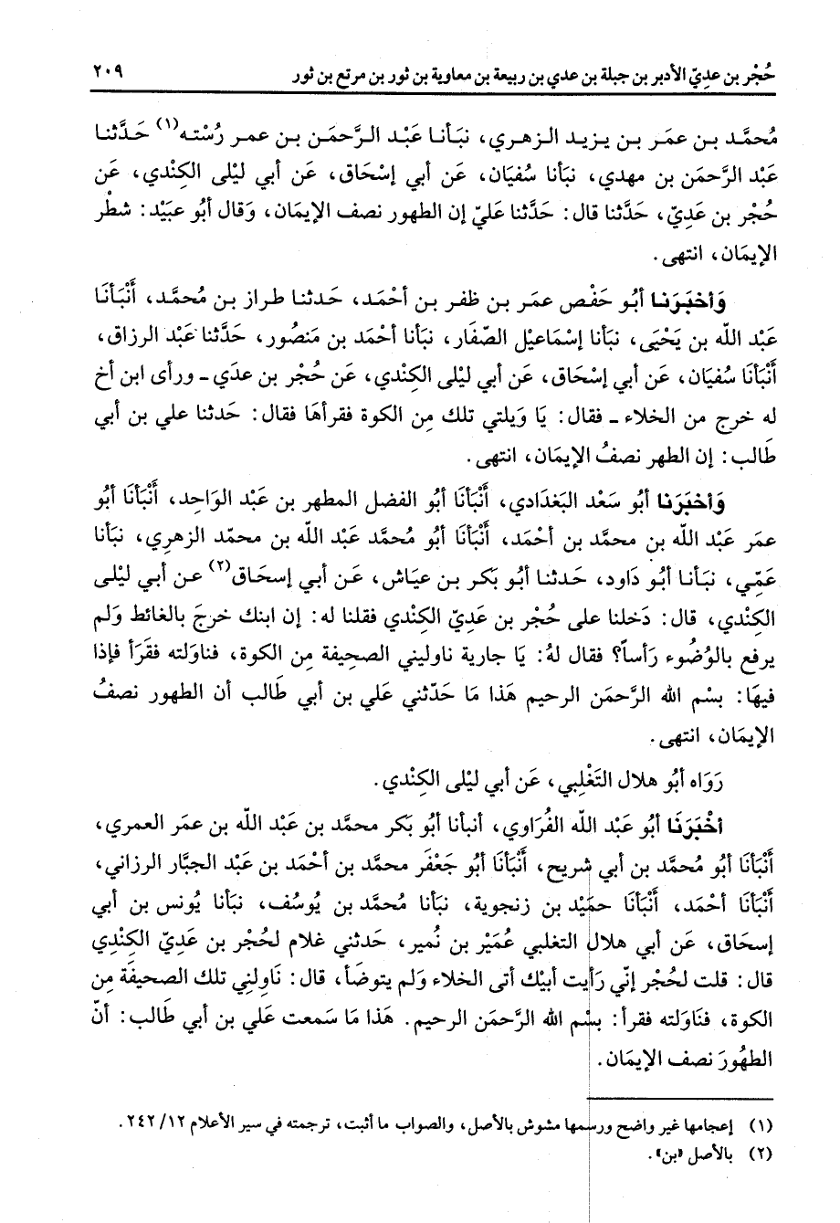 محمد بن عمر بن يزيد الزهري نبأنا عبد الرحمن بن عمر رسته (1) حدثنا عبد الرحمن بن مهدي نبأنا سفيان عن أبي إسحاق عن أبي ليلى الكندي عن حجر بن عدي حدثنا قال علي إن الطهور نصف الإيمان وقال أبو عبيد شطر الإيمان نتهى واخبرنا أبو حفص عمر بن ظفر بن احمد حدثنا طراز بن محمد أنبأنا عبد الله بن يحيى نبأنا إسماعيل الصفار نبأنا احمد بن منصور حدثنا عبد الرزاق أنبأنا سفيان عن أبي إسحاق عن أبي ليلى الكندي عن حجر بن عدي ورأى ابن أخ له خرج من الخلاء فقال يا ويلتي تلك من الكوة فقرأها فقال حدثنا علي بن أبي طالب أن الطهر نصف الإيمان انتهى واخبرنا أبو سعد البغدادي أنبأنا أبو الفضل المطهر بن عبد الواحد أنبأنا أبو عمر عبد الله بن محمد بن احمد أنبأنا أبو محمد عبد الله بن محمد الزهري نبأنا عمي نبأنا أبو داود حدثنا أبو بكر بن عياش عن أبي إسحاق (2) عن أبي ليلى الكندي قال دخلنا على حجر بن عدي الكندي فقلنا له أن ابنك خرج بالغائط ولم يرفع بالوضوء رأسا فقال له يا جارية ناوليني الصحيفة من الكوة فناولته فقرأ فإذا فيها بسم الله الرحمن الرحيم هذا ما حدثني علي بن أبي طالب أن الطهور نصف الإيمان انتهى رواه أبو هلال التغلبي عن أبي ليلى الكندي اخبرنا أبو عبد الله الفراوي أنبأنا أبو بكر محمد بن عبد الله بن عمر العمري أنبأنا أبو محمد بن أبي شريح أنبأنا أبو جعفر محمد بن احمد بن عبد الجبار الرزاني أنبأنا احمد أنبأنا حميد بن زنجوية نبأنا محمد بن يوسف نبأنا يونس بن أبي إسحاق عن أبي هلال التغلبي عمير بن نمير حدثني غلام لحجر بن عدي الكندي قال قلت لحجر أني رأيت ابيك أتى الخلاء ولم يتوضأ قال ناولني تلك الصحيفة من الكوة فناولته فقرأ بسم الله الرحمن الرحيم هذا ما سمعت علي بن أبي طالب أن الطهور نصف الإيمان