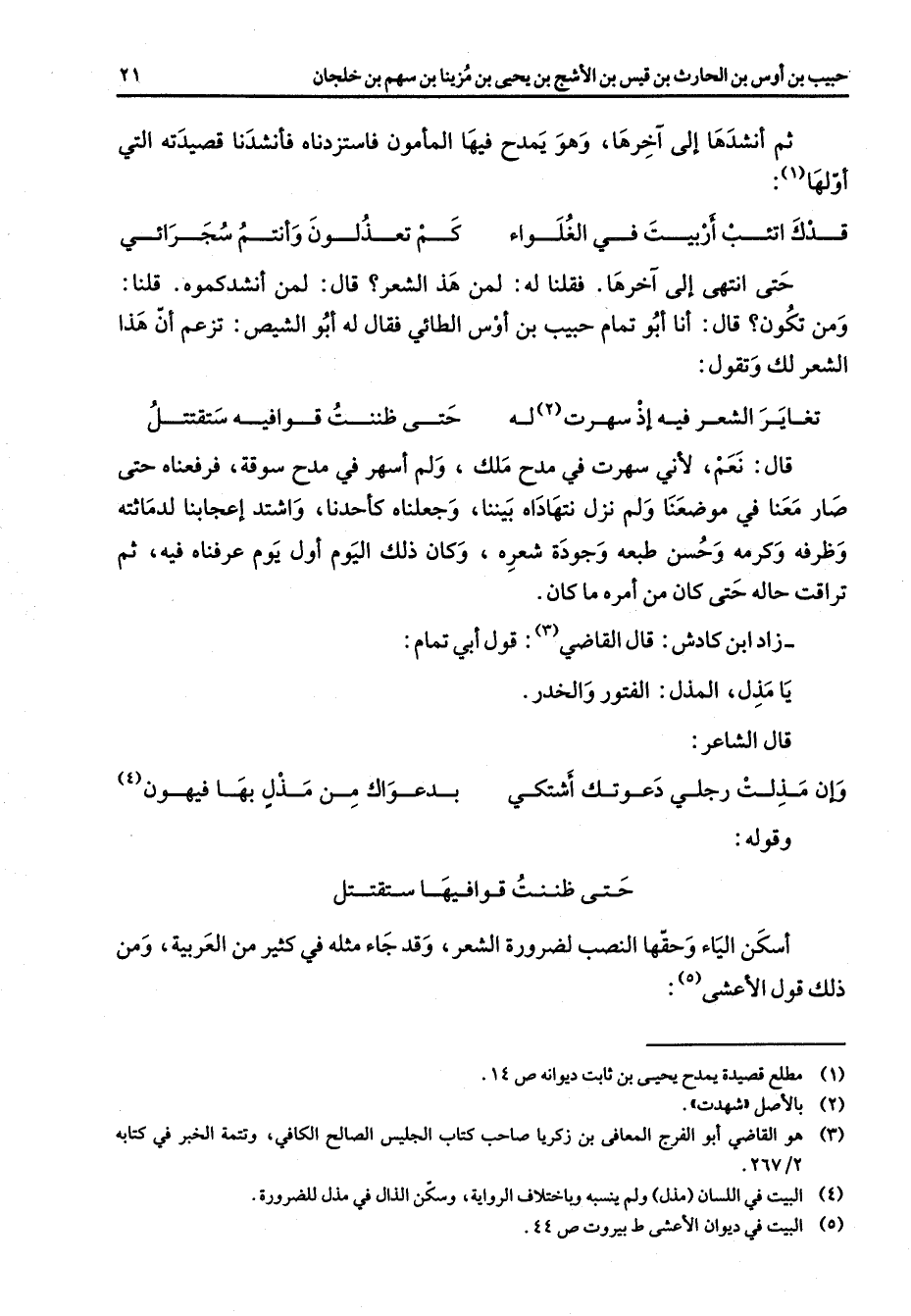 ثم أنشدها إلى آخرها وهو يمدح فيها المأمون فاستزدناه فأنشدنا قصيدته التي أولها (1) قدك اتئب أربيت في الغلواء * كم تعذلون وأنتم سجرائي * حتى انتهى إلى آخرها فقلنا له لمن هذا الشعر قال لمن أنشدكموه قلنا ومن تكون قال أنا أبو تمام حبيب بن أوس الطائي فقال له أبو الشيص تزعم أن هذا الشعر لك وتقول تغاير الشعر فيه إذ سهرت (2) له * حتى ظننت قوافيه ستقتتل * قال نعم لأني سهرت في مدح ملك ولم أسهر في مدح سوقة فرفعناه حتى صار معنا في موضعنا ولم نزل نتهاداه بيننا وجعلناه كأحدنا واشتد إعجابنا لدماثته وظرفه وكرمه وحسن طبعه وجودة شعره وكان ذلك اليوم أول يوم عرفناه فيه ثم تراقت حاله حتى كان من أمره ما كان زاد ابن كادش قال القاضي (3) قول أبي تمام يا مذل المذل الفتور والخدر قال الشاعر وإن مذلت رجلي دعوتك أشتكي * بدعواك من مذل بها فيهون (4) وقوله حتى ظننت قوافيها ستقتتل أسكن الياء وحقها النصب لضرورة الشعر وقد جاء مثله في كثير من العربية ومن ذلك قول الأعشى (5)