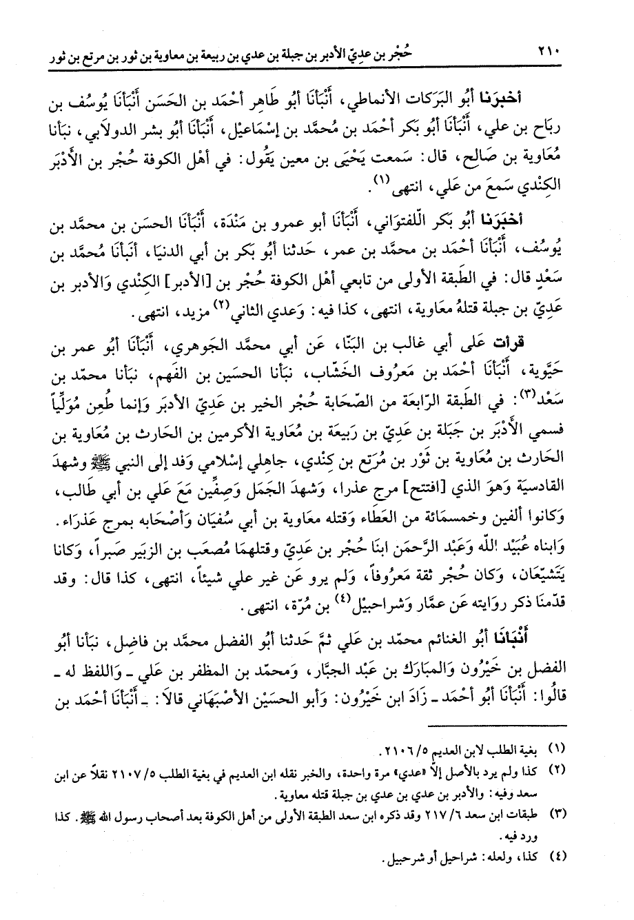 اخبرنا أبو البركات الانماطي أنبأنا أبو طاهر احمد بن الحسن أنبأنا يوسف بن رباح بن علي أنبأنا أبو بكر احمد بن محمد بن إسماعيل أنبأنا أبو بشر الدولابي نبأنا معاوية بن صالح قال سمعت يحيى بن معين يقول في أهل الكوفة حجر بن الادبر الكندي سمع من علي انتهى (1) اخبرنا أبو بكر اللفتواني أنبأنا أبو عمرو بن مندة أنبأنا الحسن بن محمد بن يوسف أنبأنا احمد بن محمد بن عمر حدثنا أبو بكر بن أبي الدنيا أنبأنا محمد بن سعد قال في الطبقة الأولى من تابعي أهل الكوفة حجر بن الادبر الكندي والادبر بن عدي بن جبلة قتله معاوية انتهى كذا فيه وعدي الثاني (2) مزيد انتهى قرأت على أبي غالب بن البنا عن أبي محمد الجوهري أنبأنا أبو عمر بن حيوية أنبأنا احمد بن معروف الخشاب نبأنا الحسين بن الفهم نبأنا محمد بن سعد (3) في الطبقة الرابعة من الصحابة حجر الخير بن عدي الادبر وانما طعن موليا فسمي الادبر بن جبلة بن عدي بن ربيعة بن معاوية الاكرمين بن الحارث بن معاوية بن الحارث بن معاوية بن ثور بن مرتع بن كندي جاهلي اسلامي وفد إلى النبي (صلى الله عليه وسلم) وشهد القادسية وهو الذي افتتح مرج عذار وشهد الجمل وصفين مع علي بن أبي طالب وكانوا ألفين وخمسمائة من العطاء وقتله معاوية بن أبي سفيان واصحابه بمرج عذراء وابناه عبيد الله وعبد الرحمن ابنا حجر بن عدي وقتلهما مصعب بن الزبير صبرا وكانا يتشيعان وكان حجر ثقة معروفا ولم يرو عن غير علي شيئا انتهى كذا قال وقد قدمنا ذكر روايته عن عمار وشراحبيل (4) بن مرة انتهى أنبأنا أبو الغنائم محمد بن علي ثم حدثنا أبو الفضل محمد بن فاضل نبأنا أبو الفضل بن خيرون المبارك بن عبد الجبار ومحمد بن المظفر بن علي واللفظ له قالوا أنبأنا أبو أحمد زاد ابن خيرون وأبو الحسين الاصبهاني قالا أنبأنا احمد بن