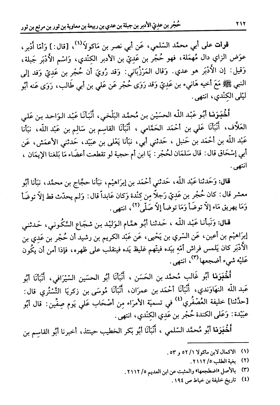 قرأت على أبي محمد السلمي عن أبي نصر بن ماكولا (1) قال واما ادبر عوض الزاي دال مهملة فهو حجر بن عدي بن الادبر الكندي واسم الادبر جبلة وقيل أن الادبر هو عدي وقال المرزباني وقد روي أن حجر بن عدي وفد إلى النبي (صلى الله عليه وسلم) مع أخيه هانئ بن عدي وقد روى حجر عن علي بن أبي طالب روى عنه أبو ليلى الكندي انتهى اخبرنا أبو عبد الله الحسين بن محمد البلخي أنبأنا عبد الواحد بن علي العلاف أنبأنا علي بن احمد الحمامي أنبأنا القاسم بن سالم بن عبد الله نبأنا عبد الله بن احمد بن حنبل حدثني أبي نبأنا يعلى بن عبيد حدثني الاعمش عن أبي إسحاق قال قال سلمان لحجر يا ابن أم حجية لو تقطعت اعضاء ما بلغنا الإيمان انتهى قال وحدثنا عبد الله حدثني احمد بن إبراهيم نبأنا حجاج بن محمد نبأنا أبو معشر قال كان حجر بن عدي رجلا من كندة وكان عابدا قال ولم يحدث قط إلا توضأ وما يهريق ماء إلا توضأ وما توضأ إلا صلى (2) انتهى قال ونبأنا عبد الله حدثنا أبو همام الوليد بن شجاع السكوني حدثني إبراهيم بن اعين عن السري بن يحيى عن عبد الكريم بن رشيد أن حجر بن عدي بن الادبر كان يلمس فراش امه بيده فيتهم غليظ يده فينقلب على ظهره فإذا امن أن يكون عليه شئ اضجعها (3) انتهى اخبرنا أبو غالب محمد بن الحسن أنبأنا أبو الحسين السيرافي أنبأنا أبو عبد الله النهاوندي أنبأنا احمد بن عمران أنبأنا موسى بن زكريا التستري قال حدثنا خليفة العصفري (4) في تسمية الأمراء من أصحاب علي يوم صفين قال أبو عبيدة وعلى الكندة حجر بن عدي الكندي انتهى اخبرنا أبو محمد السلمي أنبأنا أبو بكر الخطيب حينئذ اخبرنا أبو القاسم بن