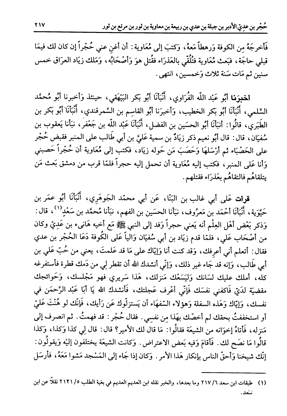 فأخرجه من الكوفة ورهطا معه وكتب إلى معاوية أن اغن عني حجرا أن كان لك فيما قبلي حاجة فبعث معاوية فتلقي بالعذراء فقتل هو واصحابه وملك زياد العراق خمس سنين ثم مات سنة ثلاث وخمسين انتهى أخبرنا أبو عبد الله الفراوي أنبأنا أبو بكر البيهقي حينئذ واخبرنا أبو محمد السلمي أنبأنا أبو بكر الخطيب واخبرنا أبو القاسم بن السمرقندي أنبأنا أبو بكر بن الطبري قالوا أنبأنا أبو الحسين بن الفضل أنبأنا عبد الله بن جعفر نبأنا يعقوب بن سفيان قال قال أبو نعيم ذكر زياد بن سمية علي بن أبي طالب على المنبر فقبض حجر على الحصباء ثم ارسلها وحصب من حوله زياد فكتب إلى معاوية أن حجرا حصبني وأنا على المنبر فكتب إليه معاوية أن تحمل إليه حجرا فلما قرب من دمشق بعث من يتلقاهم فالتقاهم بعذراء فقتلهم قرأت على أبي غالب بن البنا عن أبي محمد الجوهري أنبأنا أبو عمر بن حيوية أنبأنا احمد بن معروف نبأنا الحسين بن الفهم نبأنا محمد بن سعد (1) قال وذكر بعض أهل العلم انه يعني حجرا وفد إلى النبي (صلى الله عليه وسلم) مع أخيه هانئ بن عدي وكان من أصحاب علي فلما قدم زياد بن أبي سفيان واليا على الكوفة دعا الحجر بن عدي فقال اتعلم أني اعرفك وقد كنت أنا واياك على ما قد علمت يعني من حب علي بن أبي طالب وانه قد جاء غير ذلك واني انشدك الله أن تقطر لي من دمك قطرة فأستفرغه كله املك عليك لسانك وليسعك منزلك هذا سريري فهو مجلسك وحوائجك مقضية لدي فاكفني نفسك فإني أعرف عجلتك فأنشدك الله يا أبا عبد الرحمن في نفسك واياك وهذه السفلة وهؤلاء السفهاء أن يستزلوك عن رأيك فإنك لو هنت علي أو استخففت بحقك لم اخصك بهذا من نفسي فقال حجر قد فهمت ثم انصرف إلى منزله فأتاه اخوانه من الشيعة فقالوا ما قال لك الأمير قال قال لي كذا وكذا وكذا قالوا ما نصح لك فأقام وفيه بعض الاعتراض وكانت الشيعة يختلفون إليه ويقولون انك شيخنا واحق الناس بإنكار هذا الأمر وكان إذا جاء إلى المسجد مشوا معه فأرسل