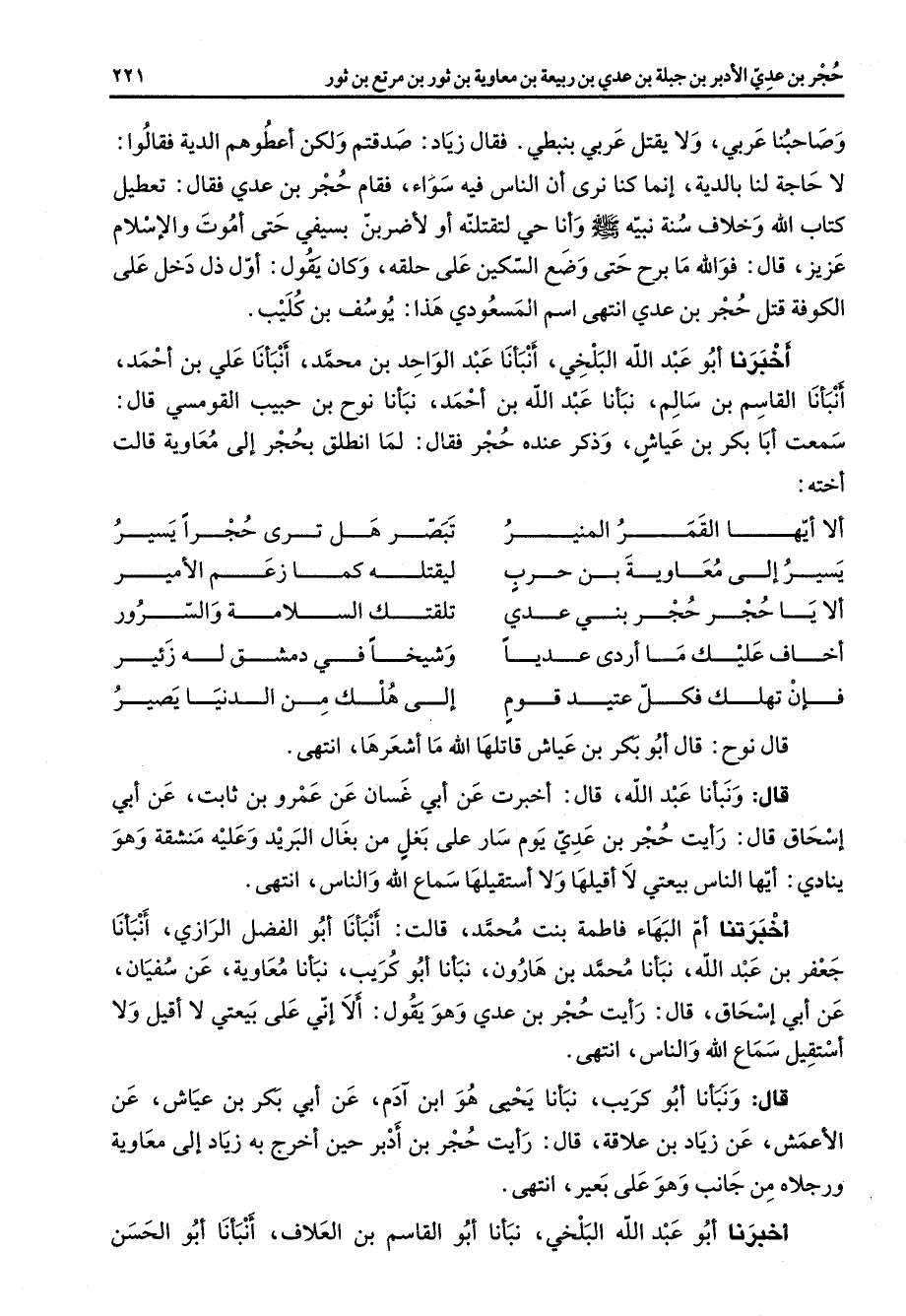 وصاحبنا عربي ولا يقتل عربي بنبطي فقال زياد صدقتم ولكن أعطوهم الدية فقالوا لا حاجة لنا بالدية إنما كنا نرى أن الناس فيه سواء فقام حجر بن عدي فقال تعطيل كتاب الله وخلاف سنة نبيه (صلى الله عليه وسلم) وأنا حي لتقتلنه أو لأضربن بسيفي حتى أموت والإسلام عزيز قال فوالله ما برح حتى وضع السكين على حلقه وكان يقول أول ذل دخل على الكوفة قتل حجر بن عدي انتهى اسم المسعودي هذا يوسف بن كليب أخبرنا أبو عبد الله البلخي أنبأنا عبد الواحد بن محمد أنبأنا علي بن أحمد أنبأنا القاسم بن سالم نبأنا عبد الله بن أحمد نبأنا نوح بن حبيب القومسي قال سمعت أبا بكر بن عياش وذكر عنده حجر فقال لما انطلق بحجر إلى معاوية قالت أخته * ألا أيها القمر المنير * تبصر هل ترى حجرا يسير يسير إلى معاوية بن حرب * ليقتله كما زعم الأمير ألا يا حجر حجر بني عدي * تلقتك السلامة والسرور أخاف عليك ما أردى عديا * وشيخا في دمشق له زئير فإن تهلك فكل عتيد قوم * إلى هلك من الدنيا يصير * قال نوح قال ابو بكر بن عياش قاتلها الله ما أشعرها انتهى قال ونبأنا عبد الله قال اخبرت عن أبي غسان عن عمرو بن ثابت عن أبي إسحاق قال رأيت حجر بن عدي يوم سار على بغل من بغال البريد وعليه منشقة وهو ينادي أيها الناس بيعني لا أقيلها ولا أستقيلها سماع اللله والناس انتهى أخبرتنا أم البهاء فاطمة بنت محمد قالت أنبأنا أبو الفضل الرازي أنبأنا جعفر بن عبد الله نبأنا محمد بن هارون نبأنا أبو كريب نبأنا معاوية عن سفيان عن أبي إسحاق قال رأيت حجر بن عدي وهو يقول ألا إني على بيعتي لا أقيل ولا أستقيل سماع الله والناس انتهى قال ونبأنا أبو كريب نبأنا يحيى هو ابن آدم عن أبي بكر بن عياش عن الأعمش عن زياد بن علاقة قال رأيت حجر بن ادبر حين أخرج به زياد إلى معاوية ورجلاه من جانب وهو على بعير انتهى أخبرنا أبو عبد الله البلخي نبأنا أبو القاسم بن العلاف أنبأنا أبو الحسن