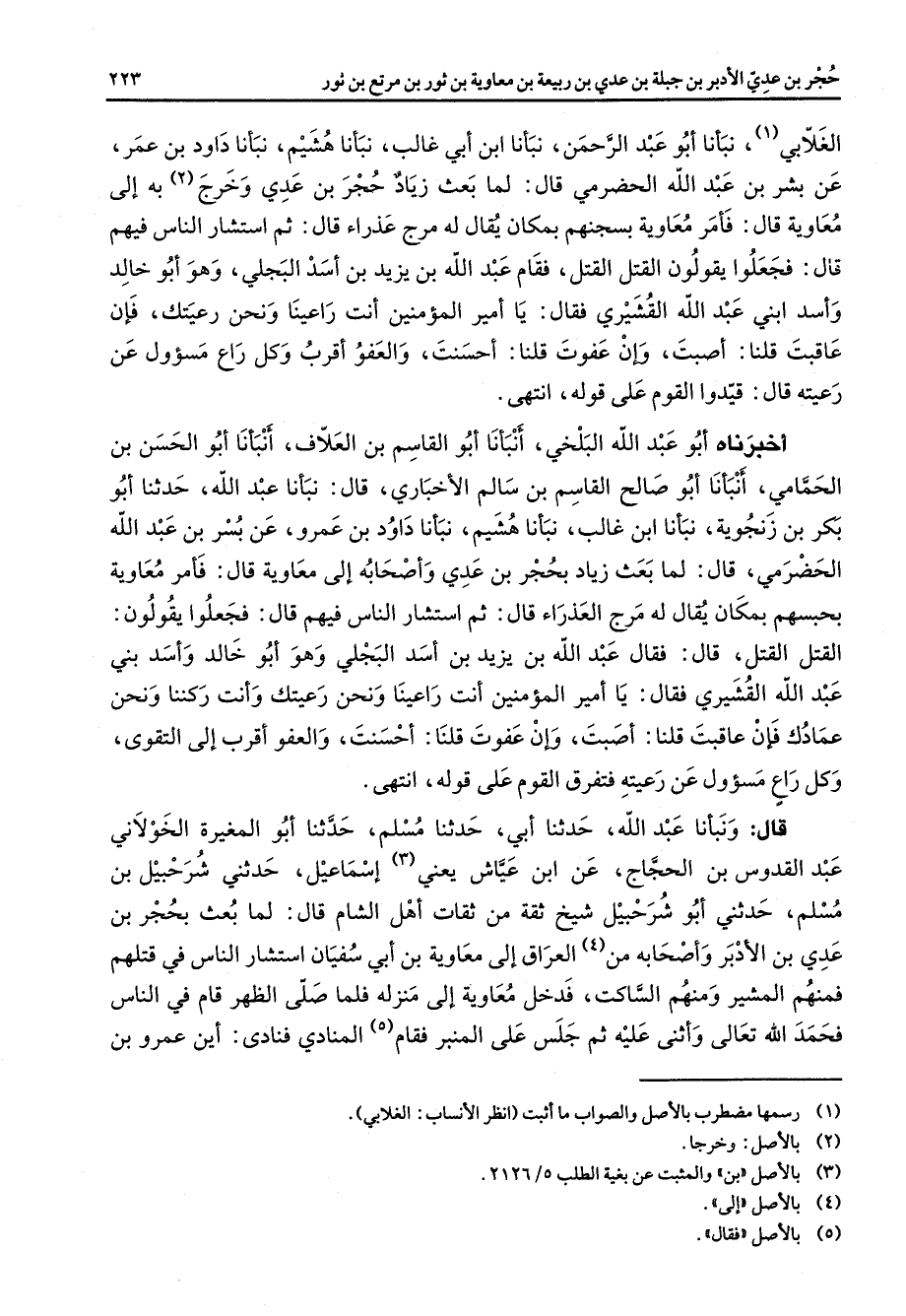 الغلابي (1) نبأنا أبو عبد الرحمن نبأنا أبن أبي غالب نبأنا هشيم نبأنا داود بن عمر عن بشر بن عبد الله الحضرمي قال لما بعث زياد حجر بن عدي وخرج (2) به إلى معاوية قال فأمر معاوية بسجنهم بمكان يقال له مرج عذراء قال ثم استشار الناس فيهم قال فجعلوا يقولون القتل القتل فقام عبد الله بن يزيد بن أسد البجلي وهو أبو خالد وأسد ابني عبد الله القشيري فقال يا أمير المؤمنين أنت راعينا ونحن رعيتك فإن عاقبت قلنا اصبت وان عفوت قلنا أحسنت والعفو اقرب وكل راع مسؤول عن رعيته قال قيدوا القوم على قوله انتهى اخبرناه أبو عبد الله البلخي أنبأنا أبو القاسم بن العلاف أنبأنا أبو الحسن بن الحمامي أنبأنا أبو صالح القاسم بن سالم الاخباري قال نبأنا عبد الله حدثنا أبو بكر بن زنجوية نبأنا ابن غالب نبانا هيثم نبأنا داود بن عمرو عن بسر بن عبد الله الحضرمي قال لما بعث زياد بحجر بن عدي واصحابه إلى معاوية قال فأمر معاوية بحبسهم بمكان يقال له مرج العذراء قال ثم استشار الناس فيهم قال فجعلوا يقولون القتل القتل قال فقال عبد الله بن يزيد بن أسد البجلي وهو أبو خالد وأسد بني عبد الله القشيري فقال يا أمير المؤمنين أنت راعينا ونحن رعيتك وأنت ركننا ونحن عمادك فان عاقبت قلنا اصبت وان عفوت قلنا أحسنت والعفو اقرب إلى التقوى وكل راع مسؤول عن رعيته فتفرق القوم على قوله انتهى قال ونبأنا عبد الله حدثنا أبي حدثنا مسلم حدثنا أبو المغيرة الخولاني عبد القدوس بن الحجاج عن ابن عياش يعني (3) إسماعيل حدثني شرحبيل بن مسلم حدثني أبو شرحبيل شيخ ثقة من ثقات أهل الشام قال لما بعث بحجر بن عدي بن الادبر واصحابه من (4) العراق إلى معاوية بن أبي سفيان استشار الناس في قتلهم فمنهم المشير ومنهم الساكت فدخل معاوية إلى منزله فلما صلى الظهر قام في الناس فحمد الله تعالى واثنى عليه ثم جلس على المنبر فقام (5) المنادي فنادى اين عمرو بن