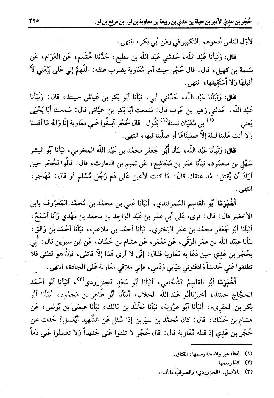 لأول الناس ادعوهم بالتكبير في زمن أبي بكر انتهى قال ونبأنا عبد الله بن مطيع حدثنا هشيم عن العوام عن سلمة بن كهيل قال قال حجر حيث أمر معاوية بضرب عنقه اللهم أني على بيعتي لا اقيلها ولا استقيلها انتهى قال ونبأنا عبد الله حدثني أبي نبأنا أبو بكر بن عياش حينئذ قال ونبأنا عبد الله حدثني زهير بن حرب قال سمعت أبا بكر بن عياش قال سمعت أبا يحيى يعني (1) بن سفيان نسنة (2) يقول قال حجرا ابلغوا عني معاوية أنا والله ما افتتنا ولا اتت علينا ليلة إلا صليناها أو صلينا فيها انتهى قال ونبأنا عبد الله نبأنا أبو جعفر محمد بن عبد الله المخرمي نبأنا أبو البشر سهل بن محمود نبأنا عمر بن مجاشع عن تميم بن الحارث قال قالوا لحجر حين أراد أن يقتل مد عنقك قال ما كنت لاعين على دم رجل مسلم أو قال مهاجر انتهى اخبرنا أبو القاسم السمرقندي أنبأنا علي بن محمد بن محمد المعروف بابن الاخضر قال قال قرئ على أبي عمر بن عبد الواحد بن محمد بن مهدي وأنا اسمع أنبأنا أبو جعفر محمد بن عمر البختري نبأنا احمد بن ملاعب نبأنا احمد بن والق نبأنا عبيد الله بن عمر الرقي عن معمر عن هشام بن حسان عن ابن سيرين قال أتي بحجر بن عدي حين دعا به معاوية فقال أني لا ارى هذا إلا قاتلي فان هو قتلني فلا تطلقوا عني حديدا وادفنوني بثيابي ودمي فاني ملاقي معاوية على الجادة انتهى اخبرنا أبو القاسم الشحامي أنبأنا أبو سعد الجنزرودي (3) أنبأنا أبو احمد الحجاج حينئذ اخبرنا أبو عبد الله الخلال أنبأنا أبو طاهر بن محمود أنبأنا أبو بكر بن المقرئ أنبأنا أبو عروبة نبأنا مخلد بن مالك نبأنا عيسى بن يونس عن هشام بن حسان قال كان محمد بن سيرين إذا سئل عن الشهيد ايغسل حدث عن حجر بن عدي إذ قتله معاوية قال قال حجر لا تلقوا عني حديدا ولا تغسلوا عني دما