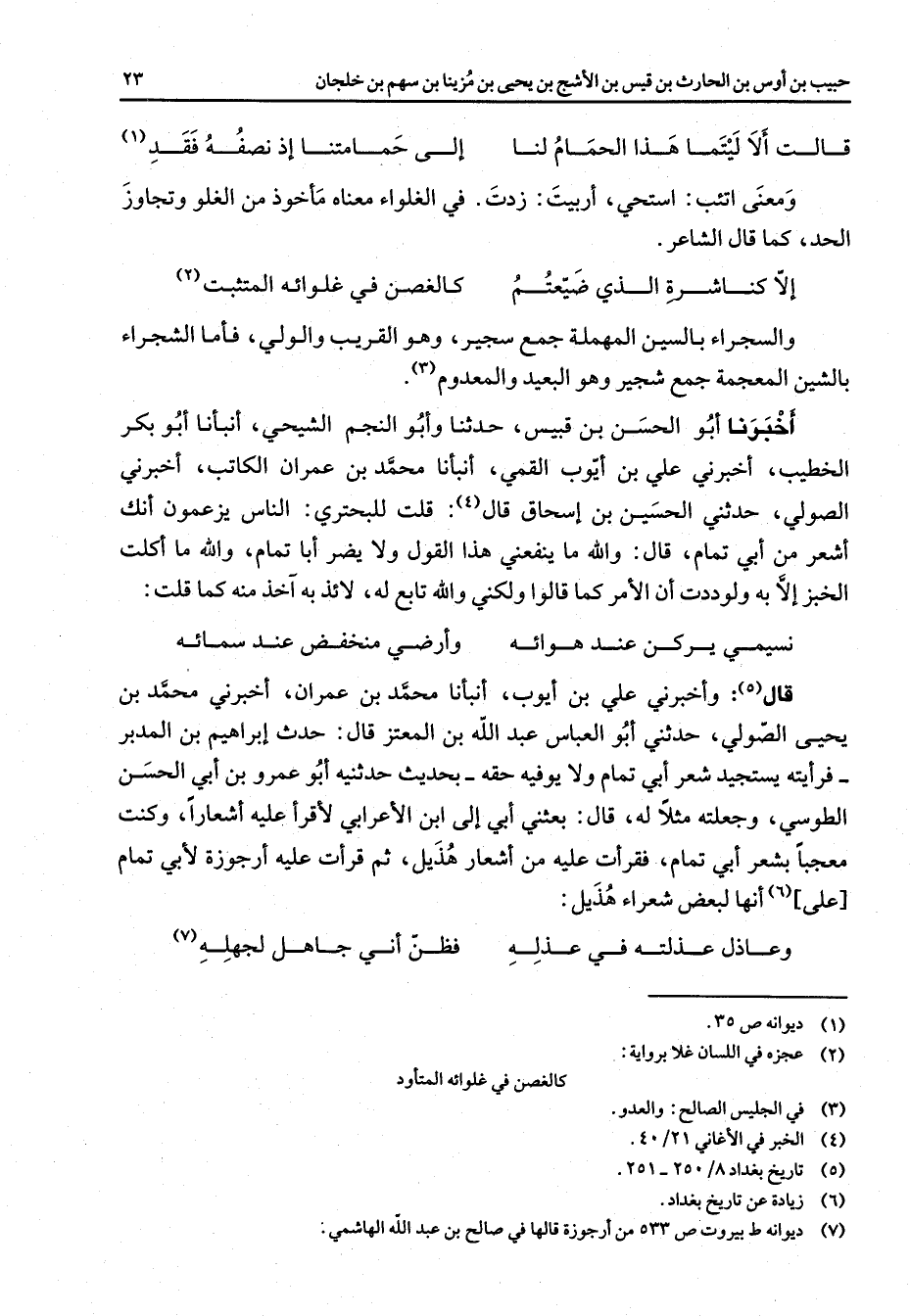 قالت ألا ليتما هذا الحمام لنا * إلى حمامتنا إذ نصفه فقد * (1) ومعنى اتئب استحي أربيت زدت في الغلواء معناه مأخوذ من الغلو وتجاوز الحد كما قال الشاعر إلا كناشرة الذي ضيعتم * كالغصن في غلوائه المتثبت * (2) والسجراء بالسين المهملة جمع سجير وهو القريب والولي فأما الشجراء بالشين المعجمة جمع شجير وهو البعيد والمعدوم (3) أخبرنا أبو الحسن بن قبيس حدثنا وأبو النجم الشيحي أنبأنا أبو بكر الخطيب أخبرني علي بن أيوب القمي أنبأنا محمد بن عمران الكاتب أخبرني الصولي حدثني الحسين بن إسحاق قال (4) قلت للبحتري الناس يزعمون أنك أشعر من أبي تمام قال والله ما ينفعني هذا القول ولا يضر أبا تمام والله ما أكلت الخبز إلا به ولوددت أن الأمر كما قالوا ولكني والله تابع له لائذ به آخذ منه كما قلت نسيمي يركن عند هوائه * وأرضي منخفض عند سمائه * قال (5) وأخبرني علي بن أيوب أنبأنا محمد بن عمران أخبرني محمد بن يحيى الصولي حدثني أبو العباس عبد الله بن المعتز قال حدث إبراهيم بن المدبر فرأيته يستجيد شعر أبي تمام ولا يوفيه حقه بحديث حدثنيه أبو عمرو بن أبي الحسن الطوسي وجعلته مثلا له قال بعثني أبي إلى ابن الأعرابي لأقرأ عليه أشعارا وكنت معجبا بشعر أبي تمام فقرأت عليه من أشعار هذيل ثم قرأت عليه أرجوزة لأبي تمام على (6) أنها لبعض شعراء هذيل وعاذل عذلته في عذله * فظن أني جاهل لجهله * (7)