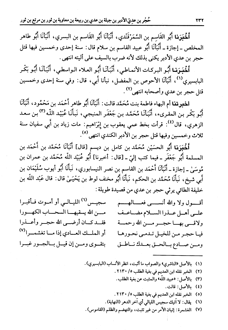 اخبرنا أبو الحسين محمد بن كامل بن ديسم قال أنبأنا محمد بن احمد بن المسلمة أبو جعفر فيما كتب الي قال اخبرنا أبو عبيد الله محمد بن عمران بن موسى اجازة أنبأنا احمد بن القاسم بن نصر النيسابوري نبأنا أبو ايوب سليمان بن أبي شيخ نبأنا محمد بن الحكم نبأنا أبو مخنف لوط بن يحيى قال قال عبد الله بن خليفة الطائي يرثي حجر بن عدي من قصيدة طويلة * اقول ولا والله انسى فعالهم * سجيس (6) الليالي أو اموت فأقبرا على أهل عذرا السلام مضاعف * من الله يسقيها السحاب الكهورا ولاقى بها حجر من الله رحمة * فقد كان ارضى الله حجرا واعذرا فيا حجر من للخيل تدمى نحورها * أو الملك العادي إذا ما تغشمرا (7) ومن صادع بالحق بعدك ناطق * بتقوى ومن يان قيل بالجور غبرا
