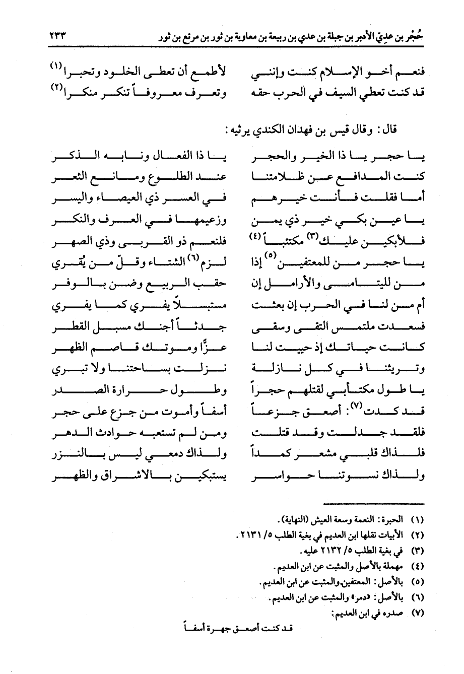 فنعم اخو الإسلام كنت وانني * لاطمع أن تعطى الخلود وتحبرا (1) قد كنت تعطي السيف في الحرب حقه * وتعرف معروفا تنكر منكرا * (2) قال وقال قيس بن فهدان الكندي يرثيه * يا حجر يا ذا الخير والحجر * يا ذا الفعال ونابه الذكر كنت المدافع عن ظلامتنا * عند الطلوع ومانع الثغر أما فقلت فأنت خيرهم * في العسر ذي العيصاء واليسر يا عين بكي خير ذي يمن * وزعيمها في العرف والنكر فلأبكين عليك (3) مكتئبا (4) * فلنعم ذو القربى وذي الصهر يا حجر من للمعتفين (5) إذا * لزم (6) الشتاء وقل من يقري من لليتامى والأرامل أن * حقب الربيع وضن بالوفر أم من لنا في الحرب أن بعثت * مستبسلا يفري كما يفري فسعدت ملتمس التقى وسقى * جدثا اجنك مسبل القطر كانت حياتك إذ حييت لنا * عزا وموتك قاصم الظهر وتريثنا في كل نازلة * نزلت بساحتنا ولا تبرى يا طول مكتأبي لقتلهم حجرا * وطول حرارة الصدر قد كدت (7) اصعق جزعا * اسفا واموت من جزع على حجر فلقد جدلت وقد قتلت * ومن لم تستعبه حوادث الدهر فلذاك قلبي مشعر كمدا * ولذاك دمعي ليس بالنزر ولذاك نسوتنا حواسر * يستبكين بالأشراق والظهر