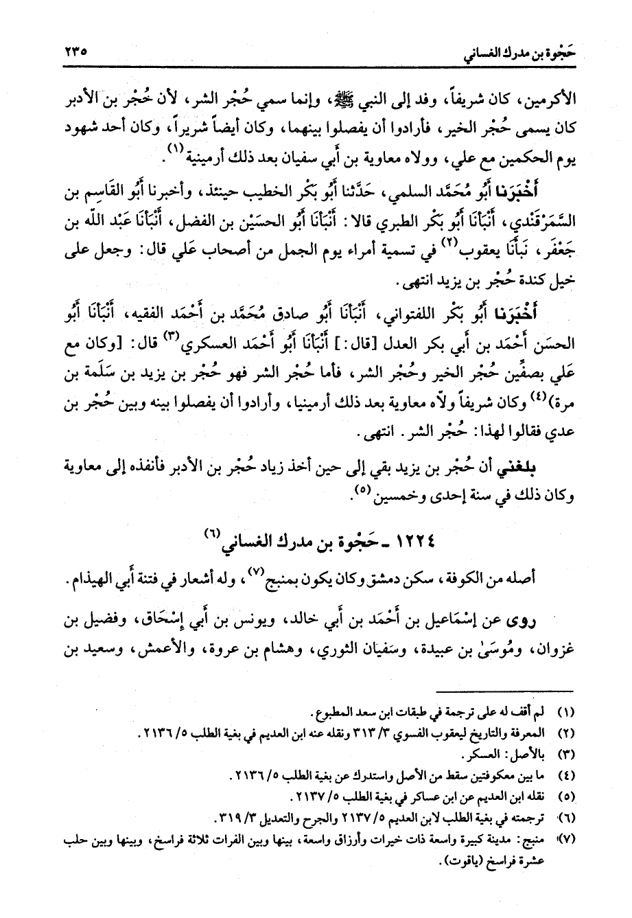 1224 - حجوة بن مدرك الغساني (6) اصله من الكوفة سكن دمشق وكان يكون بمنبج (7) وله أشعار في فتنة أبي الهيذام روى عن إسماعيل بن احمد بن أبي خالد ويونس بن أبي إسحاق وفضيل بن غزوان وموسى بن عبيدة وسفيان الثوري وهشام بن عروة والأعمش وسعيد بن