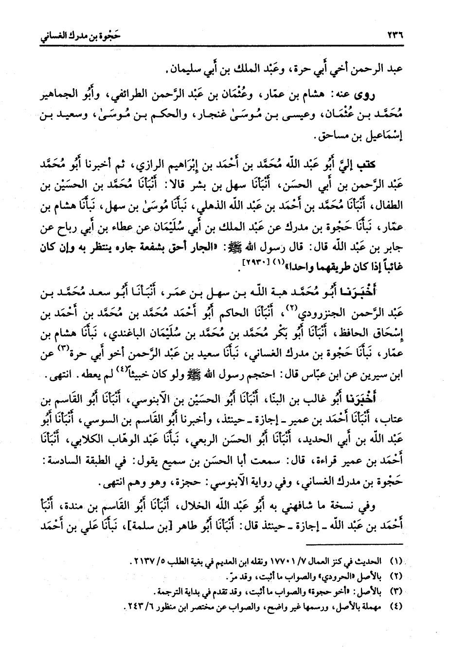 عبد الرحمن اخي أبي حرة وعبد الملك بن أبي سليمان روى عنه هشام بن عمار وعثمان بن عبد الرحمن الطرائفي وأبو الجماهير محمد بن عثمان وعيسى بن موسى غنجار والحكم بن موسى وسعيد بن إسماعيل بن مساحق كتب الي أبو عبد الله محمد بن احمد بن إبراهيم الرازي ثم اخبرنا أبو محمد عبد الرحمن بن أبي الحسن أنبأنا سهل بن بشر قالا أنبأنا محمد بن الحسين بن الطفال أنبأنا محمد بن احمد بن عبد الله الذهلي نبأنا موسى بن سهل نبأنا هشام بن عمار نبأنا حجوة بن مدرك عن عبد الملك بن أبي سليمان عن عطاء بن أبي رباح عن جابر بن عبد الله قال قال رسول الله (صلى الله عليه وسلم) الجار احق بشفعة جاره ينتظر به وان كان غائبا إذا كان طريقهما واحدا (1) اخبرنا أبو محمد هبة الله بن سهل بن عمر أنبأنا أبو سعد محمد بن عبد الرحمن الجنزرودي (2) أنبأنا الحاكم أبو احمد محمد بن محمد بن احمد بن إسحاق الحافظ أنبأنا أبو بكر محمد بن محمد بن سليمان الباغندي نبأنا هشام بن عمار نبأنا حجوة بن مدرك الغساني نبأنا سعيد بن عبد الرحمن اخو أبي حرة (3) عن ابن سيرين عن ابن عباس قال احتجم رسول الله (صلى الله عليه وسلم) ولو كان خبيثا (4) لم يعطه انتهى اخبرنا أبو غالب بن البنا أنبأنا أبو الحسين بن الابنوسي أنبأنا أبو القاسم بن عتاب أنبأنا احمد بن عمير اجازة حينئذ واخبرنها أبو القاسم بن السوسي أنبأنا أبو عبد الله بن أبي الحديد أنبأنا أبو الحسن الربعي نبأنا عبد الوهاب الكلابي أنبأنا أحمد بن عمير قراءة قال سمعت أبا الحسن بن سميع يقول في الطبقة السادسة حجوة بن مدرك الغساني وفي رواية الابنوسي حجزة وهو وهم انتهى وفي نسخة ما شافهني به أبو عبد الله الخلال أنبأنا أبو القاسم بن مندة أنبأ احمد بن عبد الله اجازة حينئذ قال أنبأنا أبو طاهر بن سلمة نبأنا علي بن احمد