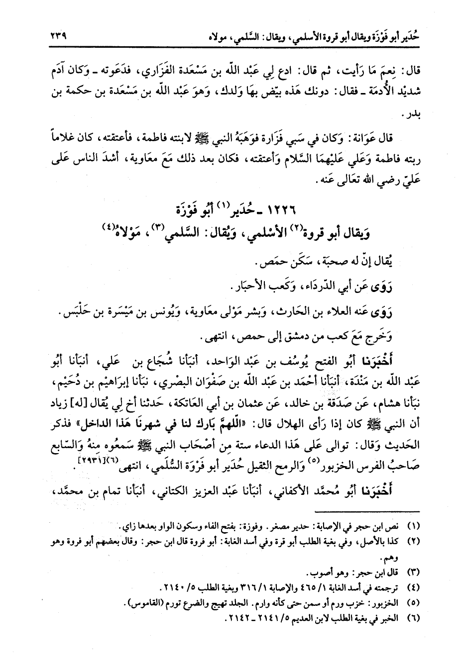 1226 - حدير (1) أبو فوزة ويقال أبو قروة (2) الاسلمي ويقال السلمي (3) مولاه (4) يقال ان له صحبة سكن حمص روى عن أبي الدرداء وكعب الأحبار روى عنه العلاء بن الحارث وبشر مولى معاوية ويونس بن ميسرة بن حلبس وخرج مع كعب من دمشق إلى حمص انتهى اخبرنا أبو الفتح يوسف بن عبد الواحد أنبأنا شجاع بن علي أنبأنا أبو عبد الله بن مندة أنبأنا احمد بن عبد الله بن صفوان البصري نبأنا إبراهيم بن دحيم نبأنا هشام عن صدقة بن خالد عن عثمان بن أبي العاتكة حدثنا أخ لي يقال له زياد أن النبي (صلى الله عليه وسلم) كان إذا رأى الهلال قال اللهم بارك لنا في شهرنا هذا الداخل فذكر الحديث وقال توالى على هذا الدعاء ستة من أصحاب النبي (صلى الله عليه وسلم) سمعوه منه والسابع صاحب الفرس الخزبور (5) والرمح الثقيل حدير أبو فروة السلمي انتهى (6) اخبرنا أبو محمد الاكفاني أنبأنا عبد العزيز الكتاني أنبأنا تمام بن محمد