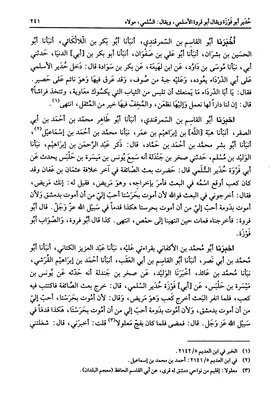 اخبرنا أبو القاسم بن السمرقندي أنبأنا أبو طاهر محمد بن احمد بن أبي الصقر أنبأنا هبة الله بن إبراهيم بن عمر نبأنا محمد بن أحمد بن إسماعيل (2) أنبأنا أبو بشر محمد بن احمد بن حماد قال ذكر عبد الرحمن بن إبراهيم نبأنا الوليد بن مسلم حدثني صخر بن جندلة انه سمع يونس بن ميسرة بن حلبس يحدث عن أبي فروة حدير السلمي قال حضرت بعث الصائفة في آخر خلافة عثمان بن عفان وقد كان كعب اوقع اسمه في البعث فأمر باخراجه وهو مريض قيل فقيل له انك مريض فقال اخرجوني في البعث فو الله لان اموت بحرستا احب إلى من أن اموت بدمشق ولان أموت بدومة احب الي من أن اموت بحرستا هكذا قدما في سبيل الله عز وجل قال أبو فروة فأخرجناه فمات حتى انتهينا إلى حمص انتهى كذا قال أبو فروة والصواب أبو فوزة اخبرنا أبو محمد بن الاكفاني بقراءتي عليه نبأنا عبد العزيز الكتاني أنبأنا أبو محمد بن أبي نصر أنبأنا أبو القاسم بن أبي العقب أنبأنا احمد بن إبراهيم القرشي نبأنا محمد بن عائذ اخبرنا الوليد عن صخر بن جندله انه حدثه عن يونس بن ميسرة بن حلبس عن أبي فوزة حدير السلمي قال خرج بعث الصائفة فاكتتب فيه كعب فلما انفر البعث اخرج كعب وهو مريض وقال لان اموت بحرستا احب الي من أن اموت بدمشق ولان اموت بدومة احب الي من أن اموت بحرستا هكذا قدما في سبيل الله عز وجل قال فمضى فلما كان بفج معلولا (3) قلت اخبرني قال شغلتني