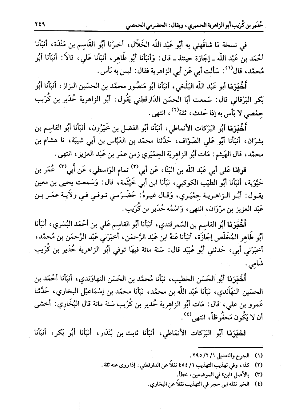في نسخة ما شافهني به أبو عبد الله الخلال اخبرنا أبو القاسم بن مندة أنبأنا احمد بن عبد الله اجازة حينئذ قال وأنبأنا أبو طاهر أنبأنا علي قالا أنبأنا أبو محمد قال (1) سألت أبي عن أبي الزاهرية فقال ليس به بأس اخبرنا أبو عبد الله البلخي أنبأنا أبو منصور محمد بن الحسين البزاز أنبأنا أبو بكر البرقاني قال سمعت أبا الحسن الدارقطني يقول أبو الزاهرية حدير بن كريب حمصي لا بأس به إذا حدث ثقة (2) انتهى اخبرنا أبو البركات الانماطي أنبأنا أبو الفضل بن خيرون أنبأنا أبو القاسم بن بشران أنبأنا أبو علي الصواف حدثنا محمد بن العباس بن أبي شيبة نا هشام بن محمد قال الهيثم مات أبو الزاهرية الحميري زمن عمر بن عبد العزيز انتهى قرأنا على أبي عبد الله بن البنا عن أبي (3) تمام الواسطي عن أبي (3) عمر بن حيوية أنبأنا أبو الطيب الكوكبي نبأنا ابن أبي خيثمة قال وسمعت يحيى بن معين يقول أبو الزاهرية حميري وقال غيره حضرمي توفي في ولاية عمر بن عبد العزيز بن مروان انتهى واسمه حدير بن كريب اخبرنا أبو القاسم بن السمرقندي أنبأنا أبو القاسم علي بن احمد البسري انبانا أبو طاهر المخلص اجازة أنبأنا عنه ابن عبد الرحمن اخبرني عبد الرحمن بن محمد اخبرني أبي حدثني أبو عبيد قال سنة مائة فيها توفي أبو الزاهرية حدير بن كريب شامي اخبرنا أبو الحسن الخطيب نبأنا محمد بن الحسن النهاوندي أنبأنا احمد بن الحسين النهاوندي نبأنا عبد الله بن محمد نبأنا محمد بن إسماعيل البخاري حدثنا عمرو بن علي قال أبو الزاهرية حدير بن كريب سنة مائة قال البخاري اخشى أن لا يكون محفوظا انتهى (4) اخبرنا أبو البركات الانماطي أنبأنا ثابت بن بندار أنبأنا أبو بكر أنبأنا