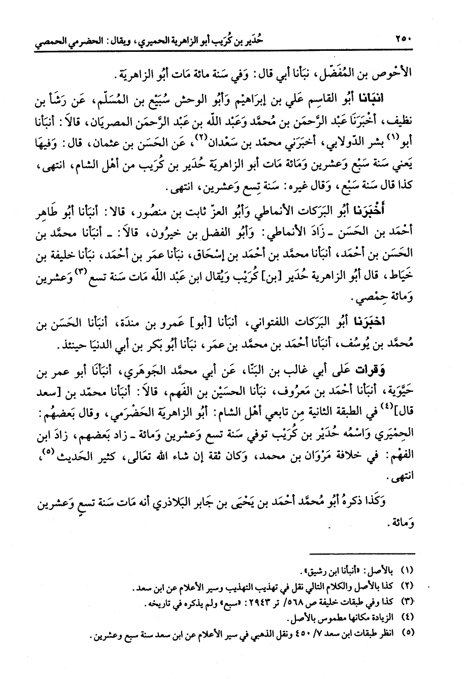 الاحوص بن المفضل نبأنا أبي قال وفي سنة مائة مات أبو الزاهرية أنبأنا أبو القاسم علي بن إبراهيم وأبو الوحش سبيع بن المسلم عن رشأ بن نظيف اخبرنا عبد الرحمن بن محمد وعبد الله بن عبد الرحمن المصريان قالا أنبأنا أبو (1) بشر الدولابي اخبرني محمد بن سعدان (2) عن الحسن بن عثمان قال وفيها يعني سنة سبع وعشرين ومائة مات أبو الزاهرية حدير بن كريب من أهل الشام انتهى كذا قال سنة سبع وقال غيره سنة تسع وعشرين انتهى اخبرنا أبو البركات الانماطي وأبو العز ثابت بن منصور قالا أنبأنا أبو طاهر احمد بن الحسن زاد الانماطي وأبو الفضل بن خيرون قالا أنبأنا محمد بن الحسن بن احمد أنبأنا محمد بن احمد بن إسحاق نبأنا عمر بن احمد نبأنا خليفة بن خياط قال أبو الزاهرية حدير بن كريب ويقال ابن عبد الله مات سنة تسع (3) وعشرين ومائة حمصي اخبرنا أبو البركات اللفتواني أنبأنا أبو عمرو بن مندة أنبأنا الحسن بن محمد بن يوسف أنبأنا احمد بن محمد بن عمر نبأنا أبو بكر بن أبي الدنيا حينئذ وقرأت على أبي غالب بن البنا عن أبي محمد الجوهري أنبأنا أبو عمر بن حيوية أنبأنا احمد بن معروف نبأنا الحسين بن الفهم قالا أنبأنا محمد بن سعد قال (4) في الطبقة الثانية من تابعي أهل الشام أبو الزاهرية الحضرمي وقال بعضهم الحميري واسمه حدير بن كريب توفي سنة تسع وعشرين ومائة زاد بعضهم زاد ابن الفهم في خلافة مروان ابن محمد وكان ثقة أن شاء الله تعالى كثير الحديث (5) انتهى وكذا ذكره أبو محمد احمد بن يحيى بن جابر البلاذري انه مات سنة تسع وعشرين ومائة