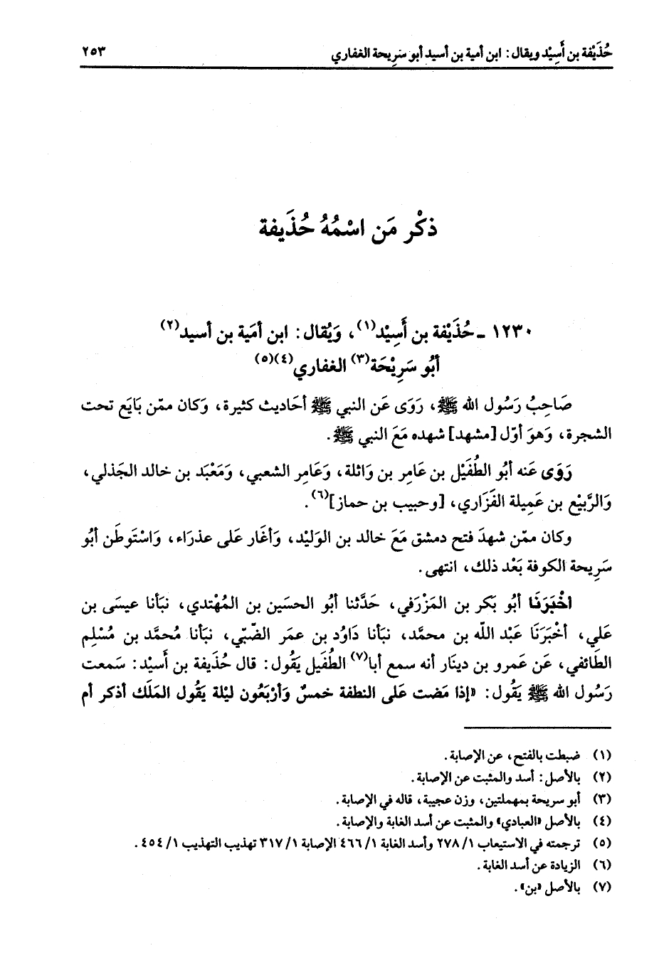 1230 - حذيفة بن اسيد (1) ويقال ابن أمية بن اسيد (2) أبو سريحة (3) الغفاري (4) (5) صاحب رسول الله (صلى الله عليه وسلم) روى عن النبي (صلى الله عليه وسلم) أحاديث كثيرة وكان ممن بايع تحت الشجرة وهو أول مشهد شهده مع النبي (صلى الله عليه وسلم) روى عنه أبو الطفيل بن عامر بن واثله وعامر الشعبي ومعبد بن خالد الجذلي والربيع بن عميلة الفزاري وحبيب بن حماز (6) وكان ممن شهد فتح دمشق مع خالد بن الوليد واغار على عذراء واستوطن أبو سريحة الكوفة بعد ذلك انتهى اخبرنا أبو بكر بن المزرفي حدثنا أبو الحسين بن المهتدي نبأنا عيسى بن علي اخبرنا عبد الله بن محمد نبأنا داود بن عمر الضبي نبأنا محمد بن مسلم الطائفي عن عمرو بن دينار انه سمع أبا (7) الطفيل يقول قال حذيفة بن اسيد سمعت رسول الله (صلى الله عليه وسلم) يقول إذا مضت على النطفة خمس واربعون ليلة يقول الملك اذكر أم