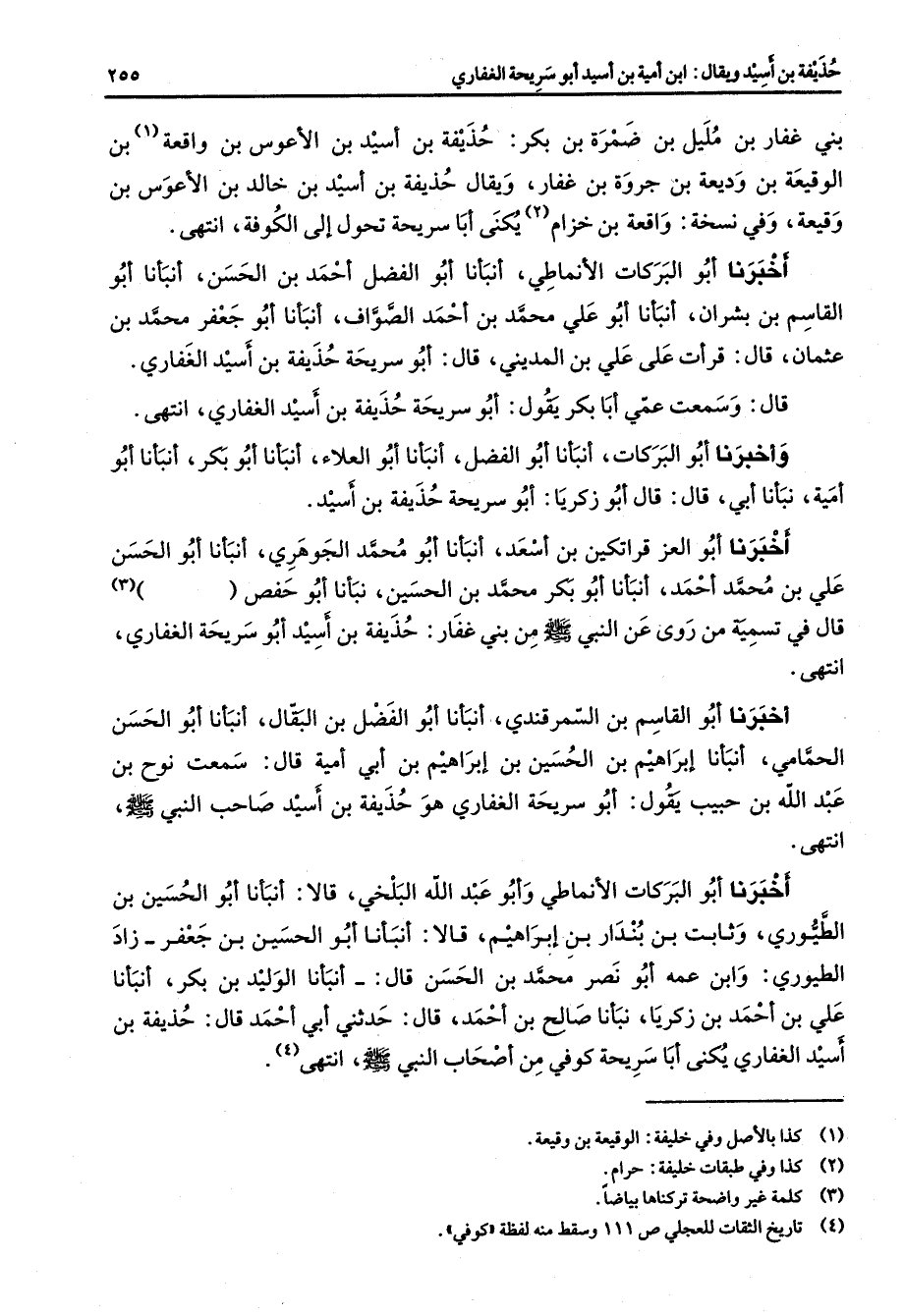 بني غفار بن مليل بن ضمرة بن بكر حذيفة بن اسيد بن الاعوس بن واقعة (1) بن الوقيعة بن وديعة بن جروة بن غفار ويقال حذيفة بن اسيد بن خالد بن الاعوس بن وقيعة وفي نسخة واقعة بن خزام (2) يكني أبا سريحة تحول إلى الكوفة انتهى اخبرنا أبو البركات الانماطي أنبأنا أبو الفضل احمد بن الحسن أنبأنا أبو القاسم بن بشران أنبأنا أبو علي محمد بن احمد الصواف أنبأنا أبو جعفر محمد بن عثمان قال قرأت على علي بن المديني قال أبو سريحة حذيفة بن اسيد الغفاري قال وسمعت عمي أبا بكر يقول أبو سريحة حذيفة بن اسيد الغفاري انتهى واخبرنا أبو البركات أنبأنا أبو الفضل أنبأنا أبو العلاء أنبأنا أبو بكر أنبأنا أبو أمية نبأنا أبي قال قال أبو زكريا أبو سريحة حذيفة بن اسيد اخبرنا أبو العز قراتكين بن اسعد أنبأنا أبو محمد الجوهري أنبأنا أبو الحسن علي بن محمد احمد أنبأنا أبو بكر محمد بن الحسين نبأنا أبو حفص (3) قال في تسمية من روى عن النبي (صلى الله عليه وسلم) من بني غفار حذيفة بن اسيد أبو سريحة الغفاري انتهى اخبرنا أبو القاسم بن السمرقندي أنبأنا أبو الفضل بن البقال أنبأنا أبو الحسن الحمامي أنبأنا إبراهيم بن الحسين بن إبراهيم بن أبي أمية قال سمعت نوح بن عبد الله بن حبيب يقول أبو سريحة الغفاري هو حذيفة بن اسيد صاحب النبي (صلى الله عليه وسلم) انتهى اخبرنا أبو البركات الانماطي وأبو عبد الله البلخي قالا أنبأنا أبو الحسين بن الطيوري وثابت بن بندار بن إبراهيم قالا أنبأنا أبو الحسين بن جعفر زاد الطيوري وابن عمه أبو نصر محمد بن الحسن قال أنبأنا الوليد بن بكر أنبأنا علي بن احمد بن زكريا نبأنا صالح بن احمد قال حدثني أبي احمد قال حذيفة بن اسيد الغفاري يكني أبا سريحة كوفي من أصحاب النبي (صلى الله عليه وسلم) انتهى (4)