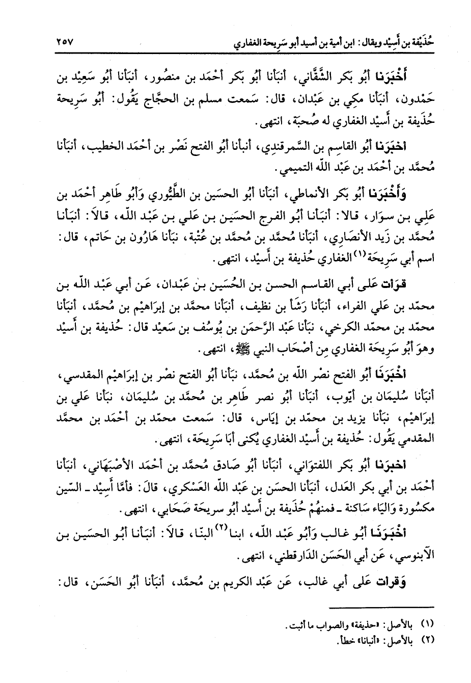 اخبرنا أبو بكر الشقاني أنبأنا أبو بكر احمد بن منصور أنبأنا أبو سعيد بن حمدون أنبأنا مكي بن عبدان قال سمعت مسلم بن الحجاج يقول أبو سريحة حذيفة بن اسيد الغفاري له صحبة انتهى اخبرنا أبو القاسم بن السمرقندي أنبأنا أبو الفتح نصر بن احمد الخطيب أنبأنا محمد بن احمد بن عبد الله التميمي واخبرنا أبو بكر الانماطي أنبأنا أبو الحسين بن الطيوري وأبو طاهر احمد بن علي بن سوار قالا أنبأنا أبو الفرج الحسين بن علي بن عبد الله قالا أنبأنا محمد بن زيد الأنصاري أنبأنا محمد بن محمد بن عتبة نبأنا هارون بن حاتم قال اسم أبي سريحة (1) الغفاري حذيفة بن اسيد انتهى قرأت على أبي القاسم الحسن بن الحسين بن عبدان عن أبي عبد الله بن محمد بن علي الفراء أنبأنا رشأ بن نظيف أنبأنا محمد بن إبراهيم بن محمد أنبأنا محمد بن محمد الكرخي نبأنا عبد الرحمن بن يوسف بن سعيد قال حذيفة بن اسيد وهو أبو سريحة الغفاري من أصحاب النبي (صلى الله عليه وسلم) انتهى اخبرنا أبو الفتح نصر الله بن محمد نبأنا أبو الفتح نصر بن إبراهيم المقدسي أنبأنا سليمان بن ايوب أنبأنا أبو نصر طاهر بن محمد بن سليمان نبأنا علي بن إبراهيم نبأنا يزيد بن محمد بن اياس قال سمعت محمد بن احمد بن محمد المقدمي يقول حذيفة بن اسيد الغفاري يكني أبا سريحة انتهى اخبرنا أبو بكر اللفتواني أنبأنا أبو صادق محمد بن احمد الاصبهاني أنبأنا احمد بن أبي بكر العدل أنبأنا الحسن بن عبد الله العسكري قال فأما اسيد السين مكسورة والياء ساكنة فمنهم حذيفة بن اسيد أبو سريحة صحابي انتهى اخبرنا أبو غالب وأبو عبد الله ابنا (2) البنا قالا أنبأنا أبو الحسين بن الابنوسي عن أبي الحسن الدارقطني انتهى وقرأت على أبي غالب عن عبد الكريم بن محمد أنبأنا أبو الحسن قال