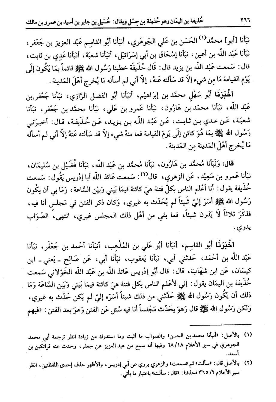 نبأنا أبو محمد (1) الحسن بن علي الجوهري أنبأنا أبو القاسم عبد العزيز بن جعفر نبأنا عبد الله بن اعين نبأنا إسحاق بن أبي إسرائيل أنبأنا شعبة أنبأنا عدي بن ثابت قال سمعت عبد الله بن يزيد قال قال حذيفة خطبنا رسول الله (صلى الله عليه وسلم) قائما بما يكون إلى يوم القيامة ما من شئ إلا قد سألته عنه إلا أني لم اسأله ما يخرج أهل المدينة اخبرنا أبو سهل محمد بن إبراهيم أنبأنا أبو الفضل الرازي نبأنا جعفر بن عبد الله نبأنا محمد بن هارون نبأنا عمرو بن علي نبأنا محمد بن جعفر نبأنا شعبة عن عدي بن ثابت عن عبد الله بن يزيد عن حذيفة قال اخبرني رسول الله (صلى الله عليه وسلم) بما هو كائن إلى يوم القيامة فما منه شئ إلا قد سألته عنه إلا لم اسأله ما يخرج أهل المدينة من المدينة قال ونبأنا محمد بن هارون نبأنا محمد بن عبد الله نبأنا فضيل بن سليمان نبأنا عمرو بن سعيد عن الزهري قال (2) سمعت عائذ الله أبا إدريس يقول سمعت حذيفة يقول أنا اعلم الناس بكل فتنة هي كائنة فيما بيني وبين الساعة وما بي أن يكون رسول الله (صلى الله عليه وسلم) اسر الي شيئا لم يحدث به غيري وكان ذكر الفتن في مجلس أنا فيه فذكر ثلاثا لا يذرن شيئا فما بقي من أهل ذلك المجلس غيري انتهى الصواب يدري اخبرنا أبو القاسم أنبأنا أبو علي بن المذهب أنبأنا احمد بن جعفر نبأنا عبد الله بن احمد حدثني أبي نبأنا يعقوب نبأنا أبي عن صالح يعني ابن كيسان عن ابن شهاب قال قال أبو إدريس عائذ الله بن عبد الله الخولاني سمعت حذيفة بن اليمان يقول أني لاعلم الناس بكل فتنة هي كائنة فيما بيني وبين الساعة وما ذلك أن يكون رسول الله (صلى الله عليه وسلم) حدثني من ذلك شيئا اسره الي لم يكن حدث به غيري ولكن رسول الله (صلى الله عليه وسلم) قال وهو يحدث مجلسا أنا فيه سئل عن الفتن وهو يعد الفتن فيهم