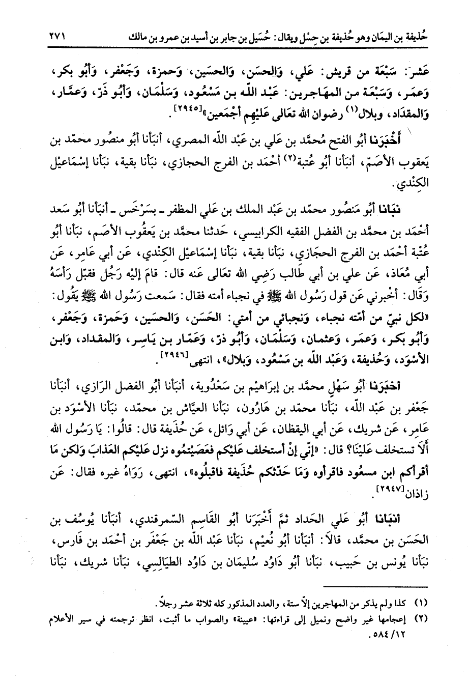 [2945] اخبرنا أبو الفتح محمد بن علي بن عبد الله المصري أنبأنا أبو منصور محمد بن يعقوب الاصم أنبأنا أبو عتبة (2) احمد بن الفرج الحجازي نبأنا بقية نبأنا إسماعيل الكندي نبأنا أبو منصور محمد بن عبد الملك بن علي المظفر بسرخس أنبأنا أبو سعد احمد بن محمد بن الفضل الفقيه الكرابيسي حدثنا محمد بن يعقوب الاصم نبأنا أبو عتبة احمد بن الفرج الحجازي نبأنا بقية نبأنا إسماعيل الكندي عن أبي عامر عن أبي معاذ عن علي بن أبي طالب رضي الله تعالى عنه قال قام إليه رجل فقبل رأسه وقال اخبرني عن قول رسول الله (صلى الله عليه وسلم) في نجباء امته فقال سمعت رسول الله (صلى الله عليه وسلم) يقول لكل نبي من امته نجباء ونجبائي من امتي الحسن والحسين وحمزة وجعفر وأبو بكر وعمر وعثمان وسلمان وأبو ذر وعمار بن ياسر والمقداد وابن الأسود وحذيفة وعبد الله بن مسعود وبلال انتهى