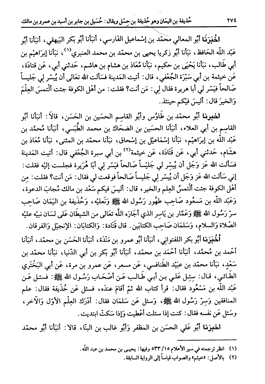 اخبرنا أبو المعالي محمد بن إسماعيل الفارسي أنبأنا أبو بكر البيهقي أنبأنا أبو عبد الله الحافظ نبأنا أبو زكريا يحيى بن محمد بن محمد العنبري (1) نبأنا إبراهيم بن أبي طالب نبأنا يحيى بن حكيم نبأنا معاذ بن هشام بن هشام حدثني أبي عن قتادة عن خيثمة بن أبي سبرة الجعفي قال أتيت المدينة فسألت الله تعالى أن ييسر لي جليسا صالحا فيسر لي أبا هريرة فقال لي من أنت فقلت من أهل الكوفة جئت التمس العلم والخير قال اليس فيكم حينئذ اخبرنا أبو محمد بن طاوس وأبو القاسم الحسين بن الحسن قالا أنبأنا أبو القاسم بن أبي العلاء نبأنا الحسين بن الضحاك بن محمد الطبسي أنبأنا محمد بن عبد الله بن إبراهيم نبأنا إسماعيل بن إسحاق نبأنا محمد بن المثنى نبأنا معاذ بن هشام حدثني أبي عن قتادة عن خيثمة (2) بن أبي سبرة الجعفي قال أتيت المدينة فسألت الله عز وجل أن ييسر لي جليسا صالحا فيسر لي أبا هريرة فجلست إليه فقلت أني سألت الله عز وجل ان ييسر لي جليسا صالحا فوقعت لي فقال من أنت فقلت من