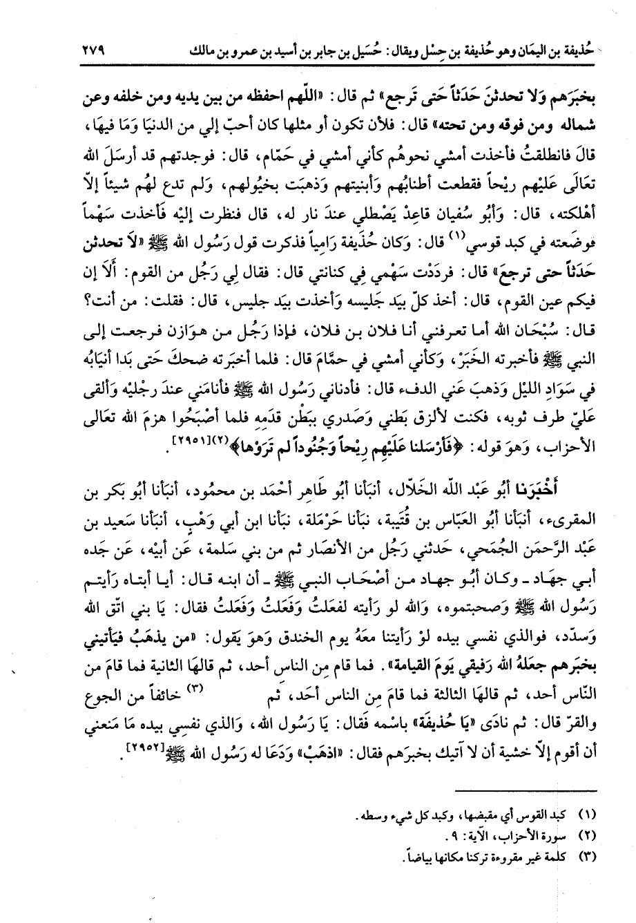 [2951] اخبرنا أبو عبد الله الخلال أنبأنا أبو طاهر احمد بن محمود أنبأنا أبو بكر بن المقرئ أنبأنا أبو العباس بن قتيبة نبأنا حرملة نبأنا ابن أبي وهب أنبأنا سعيد بن عبد الرحمن الجمحي حدثني رجل من الأنصار ثم من بني سلمة عن أبيه عن جده أبي جهاد وكان أبو جهاد من أصحاب النبي (صلى الله عليه وسلم) أن ابنه قال ايا ابتاه رأيتم رسول الله (صلى الله عليه وسلم) وصحبتموه والله لو رأيته لفعلت وفعلت وفعلت فقال يا بني اتق الله وسدد فوالذي نفسي بيده لو رأيتنا معه يوم الخندق وهو يقول من يذهب فيأتيني بخبرهم جعله الله رفيقي يوم القيامة فما قام من الناس أحد ثم قالها الثانية فما قام من الناس أحد ثم قالها الثالثة فما قام من الناس أحد ثم (3) خائفا من الجوع والقر قال ثم نادى يا حذيفة باسمه فقال يا رسول الله والذي نفسي بيده ما منعني أن اقوم إلا خشية أن لا اتيك بخبرهم فقال اذهب ودعا له رسول الله (صلى الله عليه وسلم)