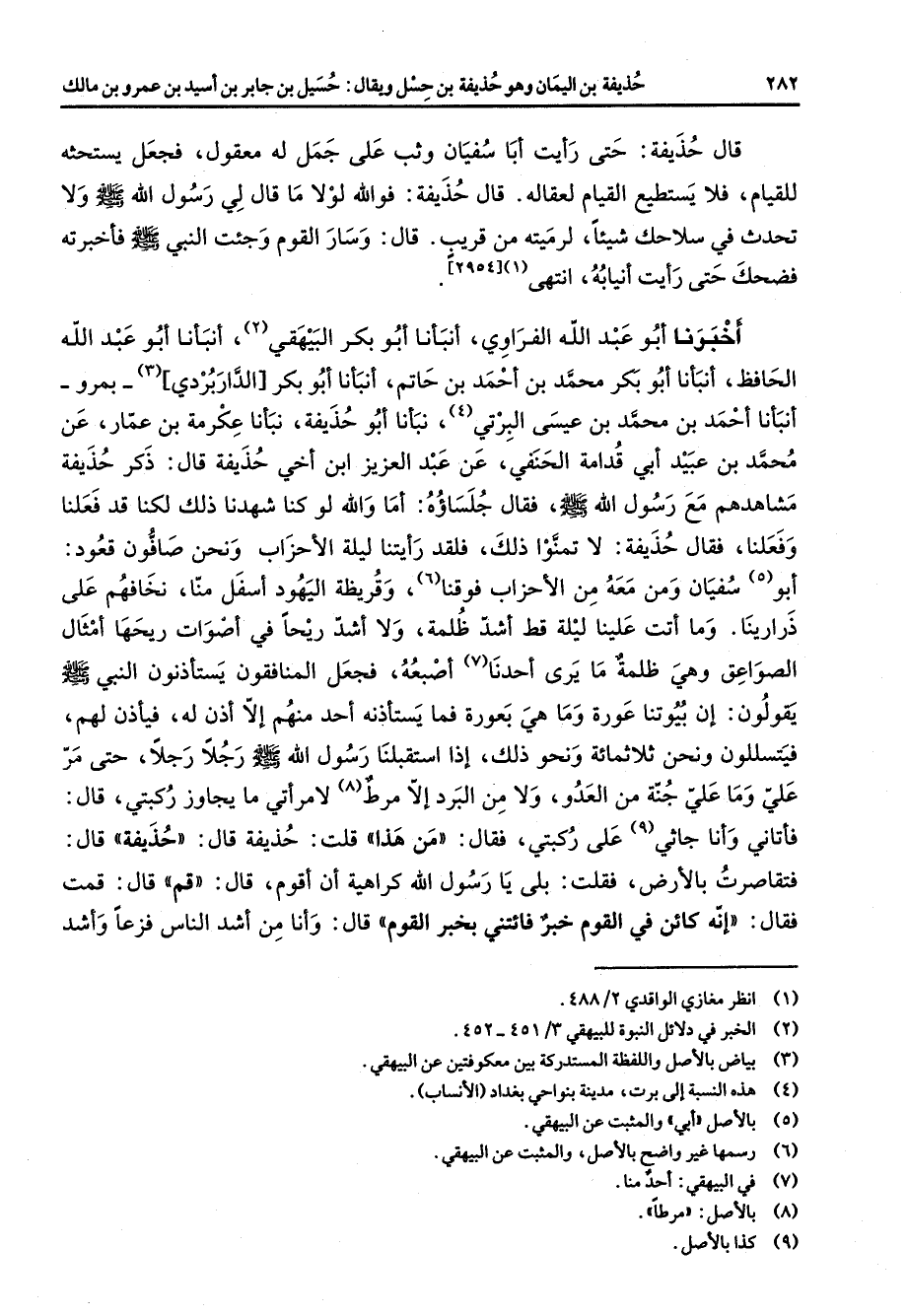 [2954] اخبرنا أبو عبد الله الفراوي أنبأنا أبو بكر البيهقي (2) أنبأنا أبو عبد الله الحافظ أنبأنا أبو بكر محمد بن أحمد بن حاتم أنبأنا أبو بكر الداربردي (3) بمرو أنبأنا أحمد بن محمد بن عيسى البرتي (4) نبأنا أبو حذيفة نبأنا عكرمة بن عمار عن محمد بن عبيد أبي قدامة الحنفي عن عبد العزيز ابن اخي حذيفة قال ذكر حذيفة مشاهدهم مع رسول الله (صلى الله عليه وسلم) فقال جلساؤه أما والله لو كنا شهدنا ذلك لكنا قد فعلنا وفعلنا فقال حذيفة لا تمنوا ذلك فلقد رأيتنا ليلة الأحزاب ونحن صافون قعود أبو (5) سفيان ومن معه من الأحزاب فوقنا (6) وقريظة اليهود اسفل منا نخافهم على ذرارينا وما اتت علينا ليلة قط اشد ظلمة ولا اشد ريحا في اصوات ريحها امثال الصواعق وهي ظلمة ما يرى أحدنا (7) اصبعه فجعل المنافقون يستأذون النبي (صلى الله عليه وسلم) يقولون أن بيوتنا عورة وما هي بعورة فما يستأذنه أحد منهم إلا أذن له فيأذن لهم فيتسللون ونحن ثلاثمائة ونحو ذلك إذا استقبلنا رسول الله (صلى الله عليه وسلم) رجلا رجلا حتى مر علي وما علي جنة من العدو ولا من البرد إلا مرط (8) لامرأتي ما يجاوز ركبتي قال فأتاني وأنا جاثي (9) على ركبتي فقال من هذا قلت حذيفة قال حذيفة قال فتقاصرت بالأرض فقلت بلى يا رسول الله كراهية أن اقوم قال قم قال قمت فقال انه كائن في القوم خبر فائتني بخبر القوم قال وأنا من اشد الناس فزعا واشد