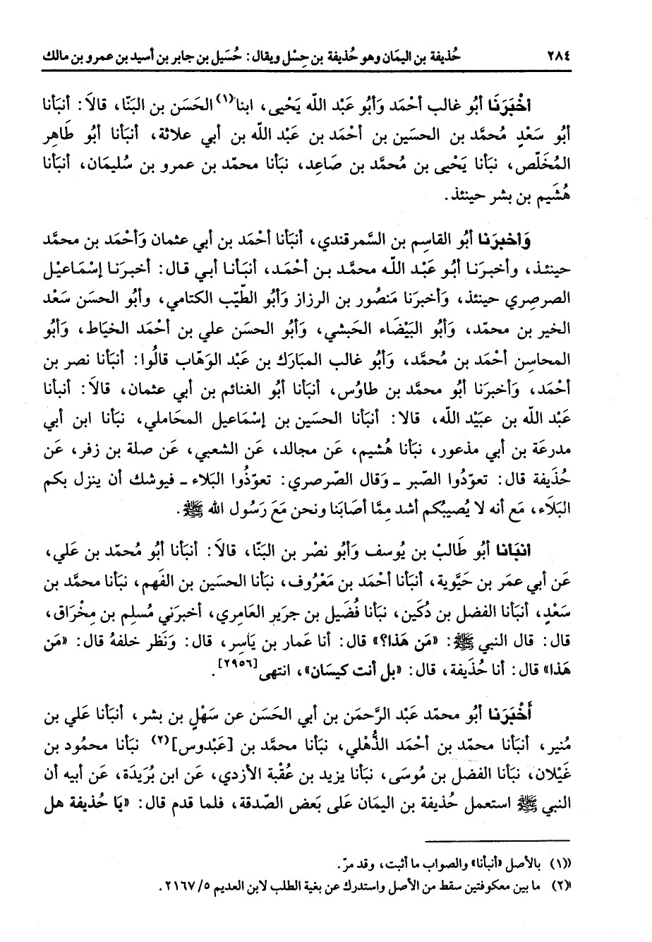 اخبرنا أبو غالب احمد وأبو عبد الله يحيى ابنا (1) الحسن بن البنا قالا أنبأنا أبو سعد محمد بن الحسين بن احمد بن عبد الله بن أبي علاثة أبنأنا أبو طاهر المخلص نبأنا يحيى بن محمد بن صاعد نبأنا محمد بن عمرو بن سليمان أنبأنا هشيم بن بشر حينئذ وأخبرنا أبو القاسم بن السمرقندي أبنأنا احمد بن أبي عثمان واحمد بن محمد حينئذ وأخبرنا أبو عبد الله محمد بن احمد أنبأنا أبي قال اخبرنا إسماعيل الصرصري حينئذ واخبرنا منصور بن الرزاز وأبو الطيب الكتامي وأبو الحسن سعد الخير بن محمد وأبو البيضاء الحبشي وأبو الحسن علي بن احمد الخياط وأبو المحاسن احمد بن محمد وأبو غالب المبارك بن عبد الوهاب قالوا أنبأنا نصر بن احمد واخبرنا أبو محمد بن طاوس أنبأنا أبو الغنائم بن أبي عثمان قالا أنبأنا عبد الله بن عبيد الله قالا أنبأنا الحسين بن إسماعيل المحاملي نبأنا ابن أبي مدرعة بن أبي مذعور نبأنا هشيم عن مجالد عن الشعبي عن صلة بن زفر عن حذيفة قال تعودا الصبر وقال الصرصري تعوذوا البلاء فيوشك أن ينزل بكم البلاء مع انه لا يصيبكم اشد مما اصابنا ونحن مع رسول الله صلى الله عليه وسلم أنبأنا أبو طالب بن يوسف وأبو نصر بن البنا قالا أنبأنا أبو محمد بن علي عن أبي عمر بن حيوية أنبأنا احمد بن معروف نبأنا الحسين بن الفهم نبأنا محمد بن سعد أنبأنا الفضل بن دكين نبأنا فضيل بن جرير العامري اخبرني مسلم بن مخراق قال قال النبي صلى الله عليه وسلم من هذا قال أنا عمار بن ياسر قال ونظر خلفه قال من هذا قال أنا حذيفة قال بل أنت كيسان انتهى
