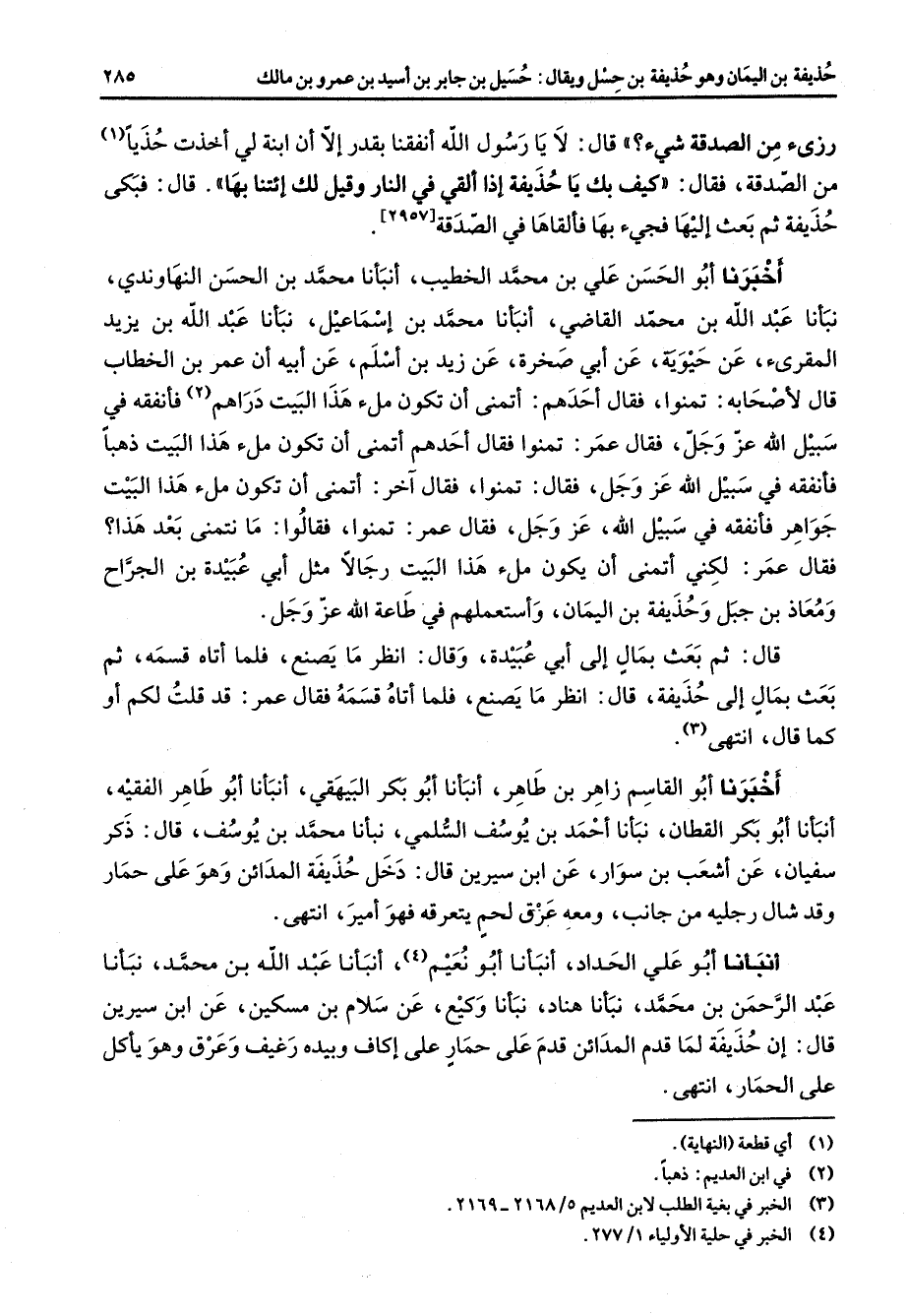 [2957] اخبرنا أبو الحسن علي بن محمد الخطيب أنبأنا محمد بن الحسن النهاوندي نبأنا عبد الله بن محمد القاضي أنبأنا محمد بن إسماعيل نبأنا عبد الله بن يزيد المقرئ عن حيوية عن أبي صخرة عن زيد بن اسلم عن أبيه أن عمر بن الخطاب قال لاصحابه تمنوا فقال أحدهم أتمان أن تكون ملء هذا البيت دراهم (2) فأنفقه في سبيل الله عز وجل فقال عمر تمنوا فقال أحدهم أتمنى أن تكون ملء هذا البيت ذهبا فأنفقه في سبيل الله عز وجل فقال تمنوا فقال آخر اتمنى أن تكون ملء هذا البيت جواهر فأنفقه في سبيل الله عز وجل فقال عمر تمنوا فقالوا ما نتمنى بعد هذا فقال عمر لكني أن يكون ملء هذا البيت رجالا مثل أبي عبيدة بن الجراح ومعاذ بن جبل وحذيفة بن اليمان واستعملهم في طاعة الله عز وجل قال ثم بعث بمال إلى أبي عبيدة وقال انظر ما يصنع فلما اتاه قسمه ثم بعث بمال إلى حذيفة قال انظر ما يصنع فلما اتاه قسمه فقال عمر قد قلت لكم أو كما قال انتهى (3) اخبرنا أبو القاسم زاهر بن طاهر أنبأنا أبو بكر البيهقي أنبأنا أبو طاهر الفقيه أنبأنا أبو بكر القطان نبأنا احمد بن يوسف السلمي نبأنا محمد بن يوسف قال ذكر سفيان عن اشعب بن سوار عن ابن سيرين قال دخل حذيفة المدائن وهو على حمار وقد شال رجليه من جانب ومعه عرق لحم يتعرقه فهو أمير انتهى أنبأنا أبو علي الحداد أنبأنا أبو نعيم (4) أنبأنا عبد الله بن محمد نبأنا عبد الرحمن بن محمد نبأنا هناد نبأنا وكيع عن سلام بن مسكين عن ابن سيرين قال أن حذيفة لما قدم المدائن قدم على حمار على اكاف وبيده رغيف وعرق وهو يأكل على الحمار انتهى