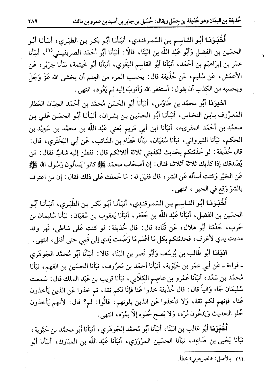 اخبرنا أبو القاسم بن السمرقندي أنبأنا أبو بكر بن الطبري أنبأنا أبو الحسين بن الفضل وأبو عبد الله بن البنا قالا أنبأنا أبو احمد الصريفيني (1) أنبأنا عمر بن إبراهيم بن احمد أنبأنا أبو القاسم البغوي أنبأنا أبو خيثمة نبأنا جرير عن الاعمش عن سليم عن حذيفة قال يحسب المرء من العلم أن يخشى الله عز وجل وبحسبه من الكذب أن يقول استغفر الله واتوب إليه ثم يعود انتهى اخبرنا أبو محمد بن طاوس أنبأنا أبو الحسن محمد بن احمد الجبان العطار المعروف بابن النخاس أنبأنا أبو الحسين بن بشران أبنأنا أبو الحسن علي بن محمد بن احمد المقرئ أنبأنا ابن أبي مريم يعني عبد الله بن محمد بن سعيد بن الحكم نبأنا القيرواني نبأنا سفيان نبأنا عطاء بن السائب عن أبي البختري قال قال حذيفة لو حدثتكم بحديث لكذبني ثلاثة اثلاثكم قال ففطن إليه شاب فقال من يصدقك إذا كذبك ثلاثة اثلاثنا فقال أن أصحاب محمد صلى الله عليه وسلم كانوا يسألون رسول الله صلى الله عليه وسلم عن الخير وكنت اسأله عن الشر قال فقيل له ما حملك على ذلك فقال أن من اعترف بالشر وقع في الخير انتهى اخبرنا أبو القاسم بن السمرقندي أنبأنا أبو بكر بن الطبري أنبأنا أبو الحسين بن الفضل أنبأنا عبد الله بن جعفر أنبأنا يعقوب بن سفيان نبأنا سليمان بن حرب حدثنا أبو هلال عن قتادة قال قال حذيفة لو كنت على شاطئ نهر وقد مددت يدي لاغرف فحدثتكم بكل ما اعلم ما وصلت يدي إلى فمي حتى اقتل انتهى أنبأنا أبو طالب بن يوسف وأبو نصر بن البنا قالا أنبأنا أبو محمد الجوهري قراءة عن أبي عمر بن حيوية أنبأنا احمد بن معروف نبأنا الحسين بن الفهم نبأنا محمد بن سعد أنبأنا عمرو بن عاصم الكلابي نبأنا قريب بن عبد الملك قال سمعت سليمان جاء واليا قال قال حذيفة خذوا عنا فإنا لكم ثقة ثم خذوا عن الذين يأخذون عنا فإنهم لكم ثقة ولا تأخذوا عن الذين يلونهم قالوا لم قال لانهم يأخذون حلو الحديث ويدعون مرة ولا يصح حلوه إلا بمره انتهى أخبرنا أبو غالب بن البنا أنبأنا أبو محمد الجوهري أنبأنا أبو محمد بن حيوية نبأنا يحيى بن صاعد نبأنا الحسين المروزي أنبأنا عبد الله بن المبارك أنبأنا أبو