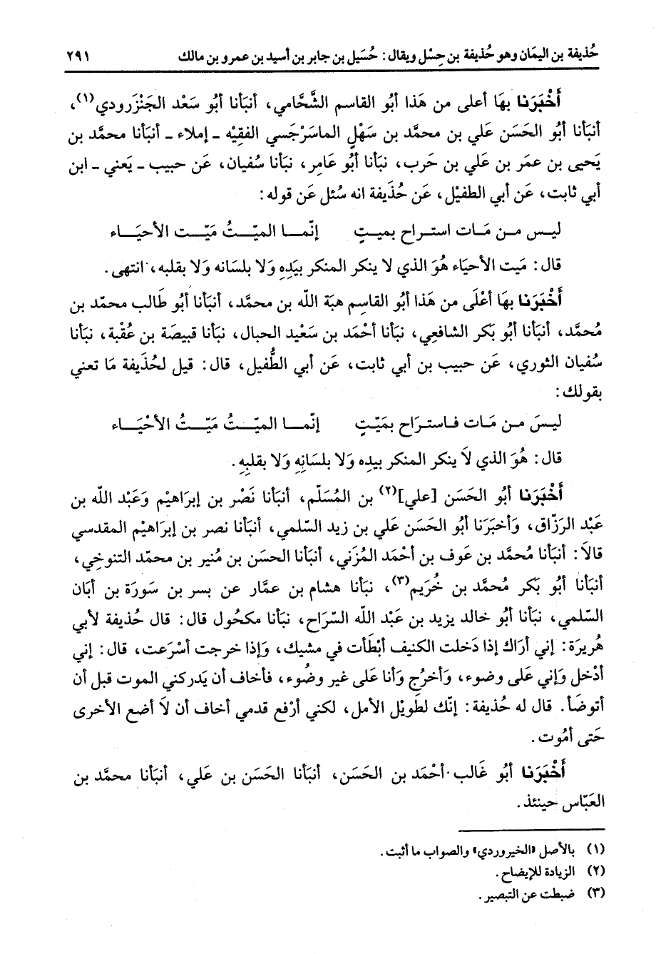 اخبرنا بها اعلى من هذا أبو القاسم الشحامي أنبأنا أبو سعد الجنزوردي (1) أنبأنا أبو الحسن علي بن محمد بن سهل الماسرجسي الفقيه إملاء أنبأنا محمد بن يحيى بن عمر بن علي بن حرب نبأنا أبو عامر نبأنا سفيان عن حبيب يعني ابن أبي ثابت عن أبي الطفيل عن حذيفة انه سئل عن قوله * ليس من مات استراح بميت * إنما الميت ميت الأحياء * قال ميت الأحياء هو الذي لا ينكر بيده ولا بلسانه ولا بقلبه انتهى اخبرنا بها اعلى من هذا القاسم هبة الله بن محمد أنبأنا أبو طالب محمد بن محمد أنبأنا أبو بكر الشافعي نبأنا احمد بن سعيد الحبال نبأنا قبيصة بن عقبة نبأنا سفيان الثوري عن حبيب بن أبي ثابت عن أبي الطفيل قال قيل لحذيفة ما تعني بقولك * ليس من مات فاستراح بميت * إنما الميت ميت الأحياء * قال هو الذي لا ينكر المنكر بيده ولا بلسانه ولا بقلبه اخبرنا أبو الحسن (2) بن المسلم أنبأنا نصر بن إبراهيم وعبد الله بن عبد الرزاق واخبرنا أبو الحسن علي بن زيد السلمي أنبأنا نصر بن إبراهيم المقدسي قالا أنبأنا محمد بن عوف بن احمد المزني أنبأنا الحسن بن منير بن محمد التنوخي أنبأنا أبو بكر محمد بن خريم (3) نبأنا هشام بن عمار عن بسر بن سورة بن ابان السلمي نبأنا أبو خالد يزيد بن عبد الله السراح نبأنا مكحول قال قال حذيفة لأبي هريرة أني أراك إذا دخلت الكنيف ابطأت في مشيك وإذا خرجت اسرعت قال أني ادخل واني على وضوء واخرج وأنا على غير وضوء فأخاف أن يدركني الموت قبل أن اتوضأ قال له حذيفة انك لطويل الامللكني ارفع قدمي اخاف أن لا اضع الأخرى حتى اموت اخبرنا أبو غالب احمد بن الحسن أنبأنا الحسن بن علي أنبأنا محمد بن العباس حينئذ