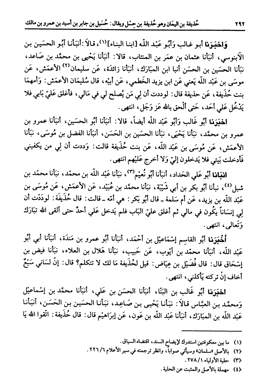 واخبرنا أبو غالب وأبو عبد الله ابنا البناء (1) قالا أنبأنا أبو الحسين بن الابنوسي أنبأنا عثمان بن عمر بن المنتاب قالا أنبأنا يحيى بن محمد بن صاعد نبأنا الحسين بن الحسن أنبا ابن المبارك أنبأنا زائدة عن سليمان (2) الاعمش عن موسى بن عبد الله يعني عن ابن يزيد الخطمي عن أبيه قال سيلمان الأعمش وامهما بنت حذيفة قال لوددت أن لي من يصلح لي في مالي فأغلق علي بابي فلا يدخل على أحد حتى الحق بالله عز وجل انتهى اخبرنا أبو غالب وأبو عبد الله أيضا قالا أنبأنا أبو الحسين أنبأنا عمرو بن عمرو بن محمد نبأنا يحيى نبأنا الحسين بن الحسن أنبأنا الفضل بن موسى نبأنا الاعمش عن موسى بن عبد الله عن بنت حذيفة قالت وددت أن لي من يكفيني فادخلت بيتي فلا يدخلون الي ولا اخرج عليهم انتهى أنبأنا أبو علي الحداد أنبأنا أبو نعيم (3) نبأنا عبد الله بن محمد نبأنا محمد بن شبل (4) نبأنا أبو بكر بن أبي شيبة نبأنا محمد بن عبيد عن الاعمش عن موسى بن عبد الله بن يزيد عن أم سلمة قال أبو بكر هي امه قالت قال حذيفة لوددت أن لي انسانا يكون في مالي ثم اغلق علي الباب فلم يدخل علي أحد حتى القى الله تبارك وتعالى انتهى اخبرنا أبو القاسم إسماعيل بن احمد أنبأنا أبو عمرو بن مندة أنبأنا أبي أبو عبد الله أنبأنا محمد بن ايوب عن حبيب نبأنا هلال بن العلاء نبأنا فيض بن إسحاق قال قال فضيل بن عياض قيل لحذيفة ما لك لا تتكلم قال أن لساني سبع اخاف أن تركته يأكلني انتهى اخبرنا أبو غالب بن البنا أنبأنا الحسن بن علي أنبأنا محمد بن إسماعيل ومحمد بن عباس قالا نبأنا يحيى بن صاعد نبأنا الحسين بن الحسن أنبأنا عبد الله بن المبارك أنبأنا عبد الله بن عون عن إبراهيم قال قال حذيفة اتقوا الله يا