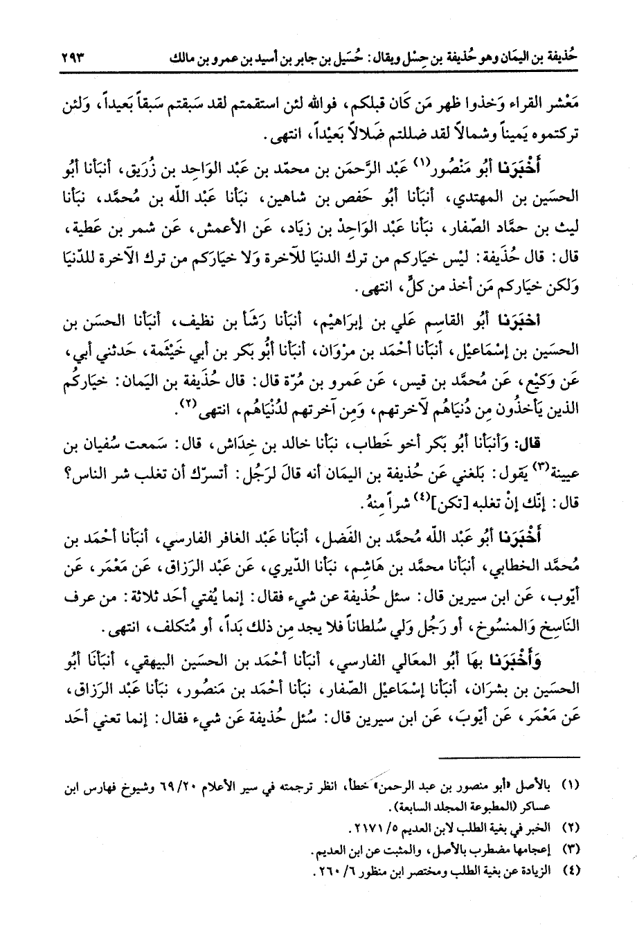 قال وأنبأنا أبو بكر اخو خطاب نبأنا خالد بن خداش قال سمعت سفيان بن عيينه (3) يقول بلغني عن حذيفة بن اليمان انه قال لرجل اتسرك أن تغلب شر الناس قال انك أن تغلبه تكن (4) شرا منه اخبرنا أبو عبد الله محمد بن الفضل أنبأنا عبد الغافر الفارسي أنبأنا احمد بن محمد الخطابي أنبأنا محمد بن هاشم نبأنا الديري عن عبد الرزاق عن معمر عن ايوب عن ابن سيرين قال سئل حذيفة عن شئ فقال إنما يفتي أحد ثلاثة من عرف الناسخ والمنسوخ أو رجل ولي سلطانا فلا يجد من ذلك بدا أو متكلف انتهى واخبرنا بها أبو المعالي الفارسي أنبأنا احمد بن الحسين البيهقي أنبأنا أبو الحسين بن بشران أنبأنا إسماعيل الصفار نبأنا احمد بن منصور نبأنا عبد الرزاق عن معمر عن ايوب عن ابن سيرين قال سئل حذيفة عن شئ فقال إنما تعني أحد