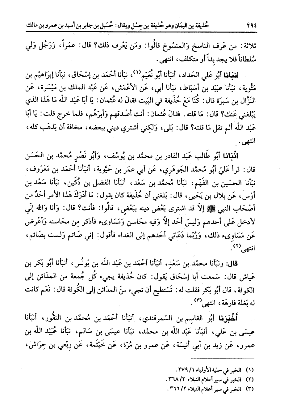 ثلاثة من عرف الناسخ والمنسوخ قالوا ومن يعرف ذلك قال عمرا ورجل ولي سلطانا فلا يجد بدا أو متكلف انتهى أنبأنا أبو علي الحداد أنبأنا أبو نعيم (1) نبأنا احمد بن إسحاق نبأنا إبراهيم بن متوية نبأنا عبيد الله بن اسباط نبأنا أبي عن الاعمش عن عبد الملك بن ميسرة عن النزال بن سبرة قال كنا مع حذيفة في البيت فقال له عثمان يا أبا عبد الله ما هذا الذي يبلغني عنك قال ما قلته فقال عثمان أنت اصدقهم وابرهم فلما خرج قلت يا أبا عبد الله الم تقل ما قلته قال بلى ولكني اشتري ديني ببعضه مخافة أن يذهب كله انتهى أنبأنا أبو طالب عبد القادر بن محمد بن يوسف وأبو نصر محمد بن الحسن قال قرأ علي أبو محمد الجوهري عن أبي عمر بن حيوية أنبأنا احمد بن معروف نبأنا الحسين بن الفهم نبأنا محمد بن سعد أنبأنا الفضل بن دكين نبأنا سعد بن اوس عن بلال بن يحيى قال بلغني أن حذيفة كان يقول ما أدرك هذا الأمر أحد من أصحاب النبي صلى الله عليه وسلم إلا قد اشتري بعض دينه ببعض قالوا فأنت قال وأنا والله أني لادخل على أحدهم وليس أحد إلا وفيه محاسن ومساوئ فأذكر من محاسنه واعرض عن مساوئ ذلك وربما دعاني أحدهم إلى الغذاء فأقول أني صائم ولست بصائم انتهى (2) قال ونبأنا محمد بن سعد نبأنا احمد بن عبد الله بن يونس أنبأنا أبو بكر بن عياش قال سمعت أبا إسحاق يقول كان حذيفة يجئ كل جمعة من المدائن إلى الكوفة قال أبو بكر فقلت له تستطيع أن تجئ من المدائن إلى الكوفة قال نعم كانت له بغلة فارهة انتهى (3) اخبرنا أبو القاسم بن السمرقندي أنبأنا احمد بن محمد بن النقور أنبأنا عيسى بن علي أنبأنا عبد الله بن محمد نبأنا عيسى بن سالم نبأنا عبيد الله بن عمرو عن زيد أبي أنيسة عن عمرو بن مرة عن خيثمة عن ربعي بن حراش