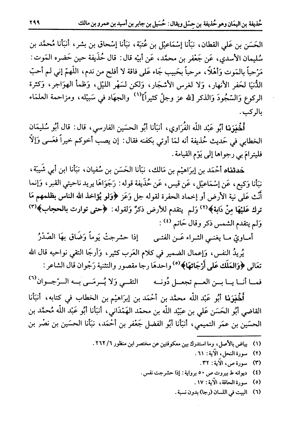 الحسن بن علي القطان نبأنا إسماعيل بن عتبة نبأنا إسحاق بن بشر أنبأنا محمد بن سليمان الاسدي عن جعفر بن محمد عن أبيه قال قال حذيفة حين حضره الموت مرحبا بالموت وأهلا مرحبا بحبيب جاء على فاقة لا افلح من ندم اللهم أني لم احب الدنيا لحفر الأنهار ولا لغرس الاشجار ولكن لسهر الليل وظمأ الهواجر وكثرة الركوع والسجود والذكر لله عز وجل كثيرا (1) والجهاد في سبيله ومزاحمة العلماء بالركب اخبرنا أبو عبد الله الفراوي ابنأنا أبو الحسين الفارسي قال قال أبو سليمان الخطابي في حديث حذيفة انه لما اوتي بكفنه فقال أن يصب اخوكم خيرا فعسى وإلا فليترام بي رجواها إلى يوم القيامة حدثناه احمد بن إبراهيم بن مالك نبأنا الحسن بن سفيان نبأنا ابن أبي شيبة نبأنا وكيع عن إسماعيل عن قيس عن حذيفة قوله رجواها يريد ناحيتي القبر وانما انث على نية الأرض أو اخماد الحفرة لقوله جل وعز " ولو يؤاخذ الله الناس بظلمهم ما ترك عليها من دابة " (2) ولم يتقدم للارض ذكر ولقوله " حتى توارت بالحجاب " (3) ولم يتقدم الشمس ذكر وقال حاتم (4) * أماوي ما يغني الثراء عن الفتى * إذا حشرجت يوما وضاق بها الصدر * يريد النفس وإعمال الضمير في كلام العرب كثير وأرجا التقي نواحيه قال الله تعالى " والملك على أرجائها " (5) واحدها رجا مقصور والتثنية رجوان قال الشاعر * فما أنا يا بن العم تجعل دونه * التقي ولا يرمى به الرجوان * (6) اخبرنا أبو عبد الله محمد بن احمد بن إبراهيم بن الخطاب في كتابه أنبأنا القاضي أبو الحسن علي بن عبيد الله بن محمد الهمداني أنبأنا أبو عبد الله محمد بن الحسين بن عمر التميمي أنبأنا أبو الفضل حعفر بن احمد نبأنا الحسين بن نصر بن