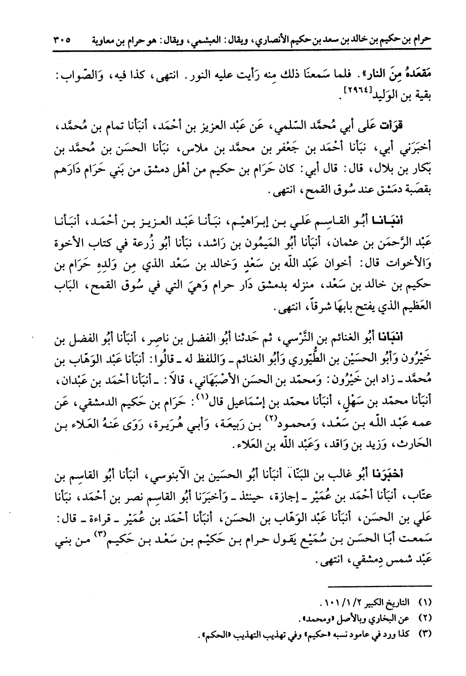 [2964] قرأت على أبي محمد السلمي عن عبد العزيز بن أحمد أنبأنا تمام بن محمد أخبرني أبي نبأنا أحمد بن جعفر بن محمد بن ملاس نبأنا الحسن بن محمد بن بكار بن بلال قال قال أبي كان حرام بن حكيم من أهل دمشق من بني حرام دارهم بقصبة دمشق عند سوق القمح انتهى أنبأنا أبو القاسم علي بن إبراهيم نبأنا عبد العزيز بن أحمد أنبأنا عبد الرحمن بن عثمان أنبأنا أبو الميمون بن راشد نبأنا أبو زرعة في كتاب الاخوة والأخوات قال أخوان عبد الله بن سعد وخالد بن سعد الذي من ولده حرام بن حكيم بن خالد بن سعد منزله بدمشق دار حرام وهي التي في سوق القمح الباب العظيم الذي يفتح بابها شرقا انتهى أنبأنا أبو الغنائم بن النرسي ثم حدثنا أبو الفضل بن ناصر أنبأنا أبو الفضل بن خيرون وأبو الحسين بن الطيوري وأبو الغنائم واللفظ له قالوا أنبأنا عبد الوهاب بن محمد زاد ابن خيرون ومحمد بن الحسن الأصبهاني قالا أنبأنا أحمد بن عبدان أنبأنا محمد بن سهل أنبأنا محمد بن إسماعيل قال (1) حرام بن حكيم الدمشقي عن عمه عبد الله بن سعد ومحمود (2) بن ربيعة وأبي هريرة روى عنه العلاء بن الحارث وزيد بن واقد وعبد الله بن العلاء أخبرنا أبو غالب بن البنا أنبأنا أبو الحسين بن الآبنوسي أنبأنا أبو القاسم بن عتاب أنبأنا احمد بن عمير اجازة حينئذ وأخبرنا أبو القاسم نصر بن أحمد نبأنا عتاب علي بن الحسن أنبأنا عبد الوهاب بن الحسن أنبأنا احمد بن عمير قراءة قال سمعت أبا الحسن بن سميع يقول حرام بن حكيم بن سعد بن حكيم (3) من بني عبد شمس دمشقي انتهى