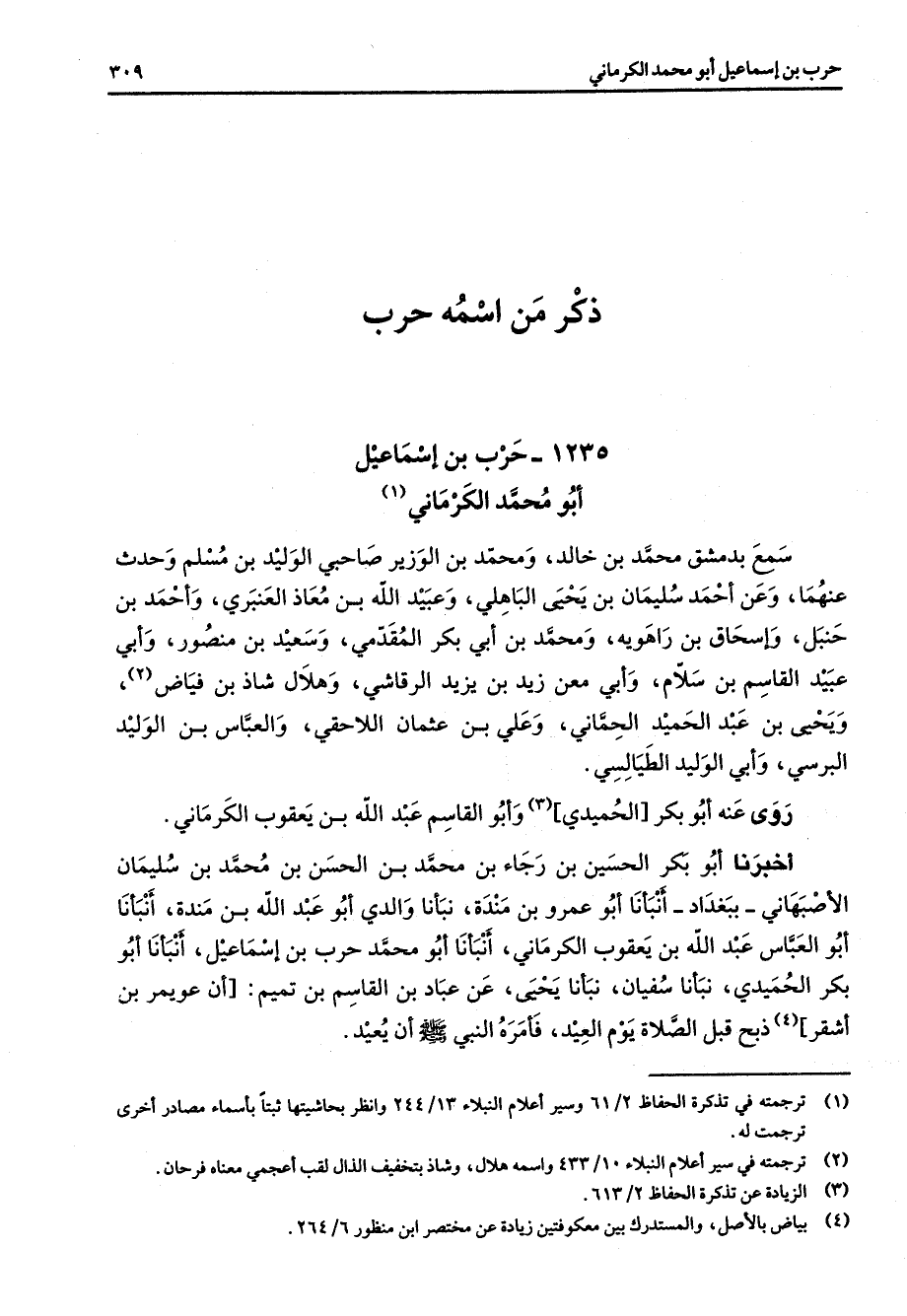 ذكر من اسمه حرب 1235 - حرب بن اسماعيل أبو محمد الكرماني (1) سمع بدمشق محمد بن خالد ومحمد بن الوزير صاحبي الوليد بن مسلم وحدث عنهما وعن أحمد سليمان بن يحيى الباهلي وعبيد الله بن معاذ العنبري وأحمد بن حنبل واسحاق بن راهويه ومحمد بن أبي بكر المقدمي وسعيد بن منصور وأبي عبيد القاسم بن سلام وأبي معن زيد بن يزيد الرقاشي وهلال شاذ بن فياض (2) ويحيى عبد الحميد الحماني وعلي بن عثمان اللاحقي والعباس بن الوليد البرسي وأبي الوليد الطيالسي روى عنه أبو بكر الحميدي (3) وأبو القاسم عبد الله بن يعقوب الكرماني أخبرنا أبو بكر الحسين بن رجاء بن محمد بن الحسن بن محمد بن سليمان الاصبهاني ببغداد أنبأنا أبو عمرو بن مندة نبأنا والدي أبو عبد الله بن مندة أنبأنا أبو العباس عبد الله بن يعقوب الكرماني أنبأنا أبو محمد حرب بن اسماعيل أنبأنا أبو بكر الحميدي نبأنا سفيان نبأنا يحيى عن عباد بن القاسم بن تميم أن عويمر بن أشقر (4) ذبح قبل الصلاة يوم العيد فأمره النبي صلى الله عليه وسلم أن يعيد