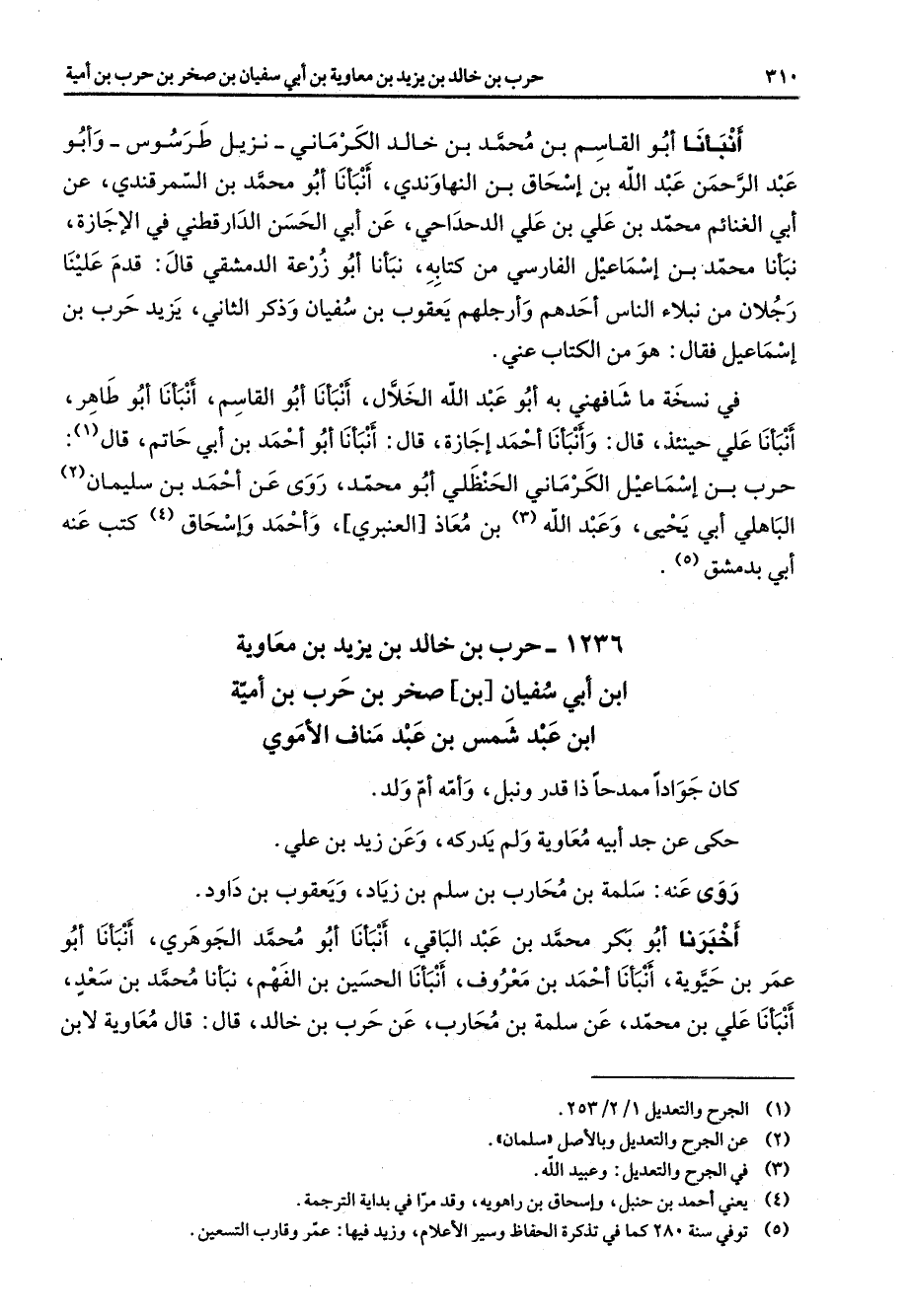أنبأنا أبو القاسم بن محمد بن خالد الكرماني نزيل طرسوس وأبو عبد الرحمن عبد الله بن اسحاق بن النهاوندي أنبأنا أبو محمد بن السمرقندي عن أبي الغنائم محمد بن علي بن علي الدحداحي عن أبي الحسن الدارقطني في الاجازة نبأنا محمد بن اسماعيل الفارسي من كتابه نبأنا أبو زرعة الدمشقي قال قدم علينا رجلان من نبلاء الناس أحدهم وأرجلهم يعقوب بن سفيان وذكر الثاني يزيد حرب بن اسماعيل فقال هو من الكتاب عني في نسخة ما شافهني به أبو عبد الله الخلال أنبأنا أبو القاسم أنبأنا أبو طاهر أنبأنا علي حينئذ قال وأنبأنا احمد اجازة قال أنبأنا أبو احمد بن أبي حاتم قال (1) حرب بن اسماعيل الكرماني الحنظلي أبو محمد روى عن احمد بن سليمان (2) الباهلي أبي يحيى وعبد الله (3) بن معاذ العنبري وأحمد واسحاق (4) كتب عنه أبي بدمشق (5)