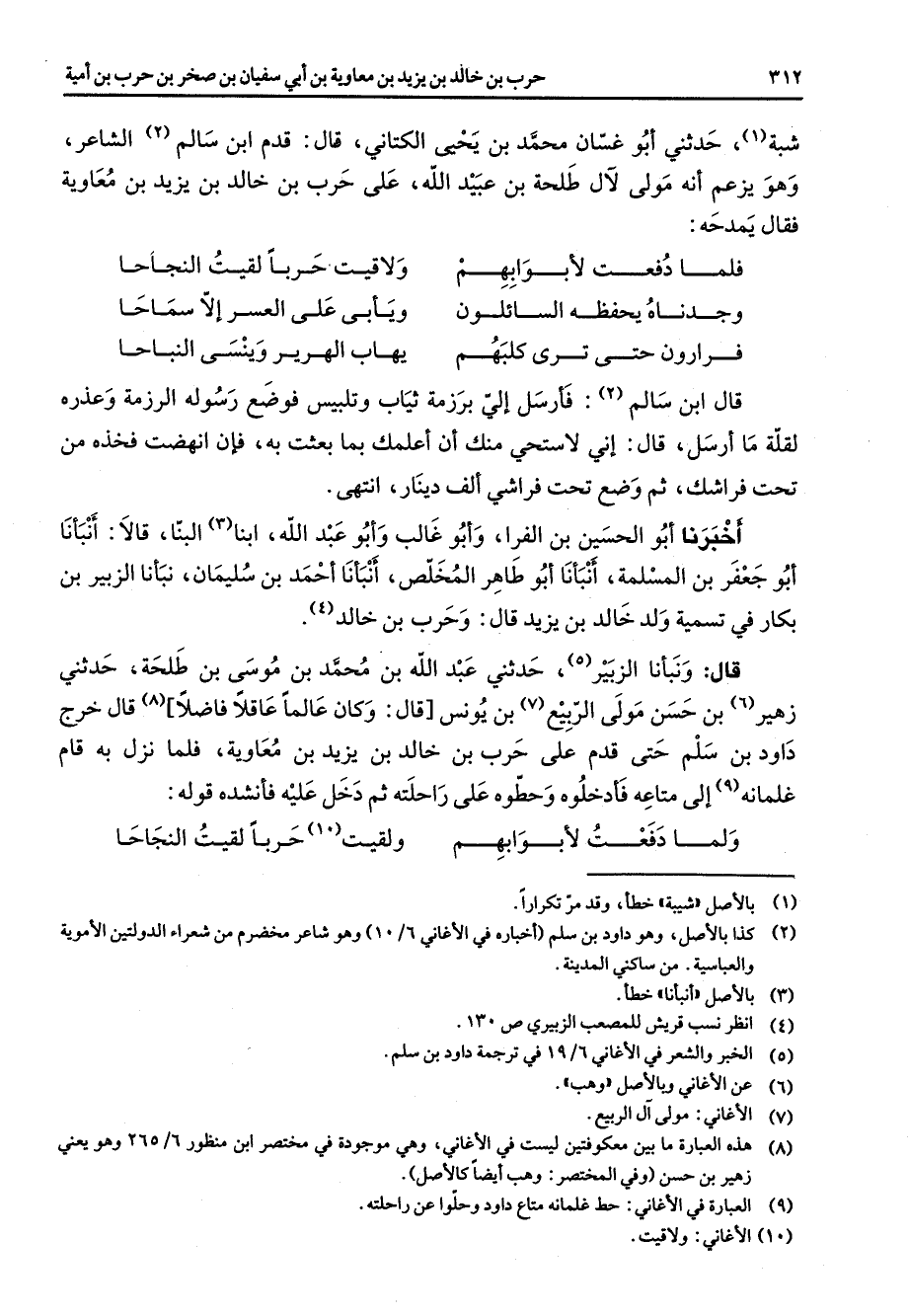 قال ونبأنا الزبير (5) حدثني عبد الله بن محمد بن موسى بن طلحة حدثني زهير (6) بن حسن مولى الربيع (7) بن يونس قال وكان عالما عاقلا فاضلا (8) قال خرج داود بن سلم حتى قدم على حرب بن خالد بن يزيد بن معاوية فلما نزل به قام غلمانه (9) إلى متاعه فأدخلوه وحطوه على راحلته ثم دخل عليه فأنشده قوله * ولما دفعت لأبوابهم * ولقيت (10) حربا لقيت النجاحا