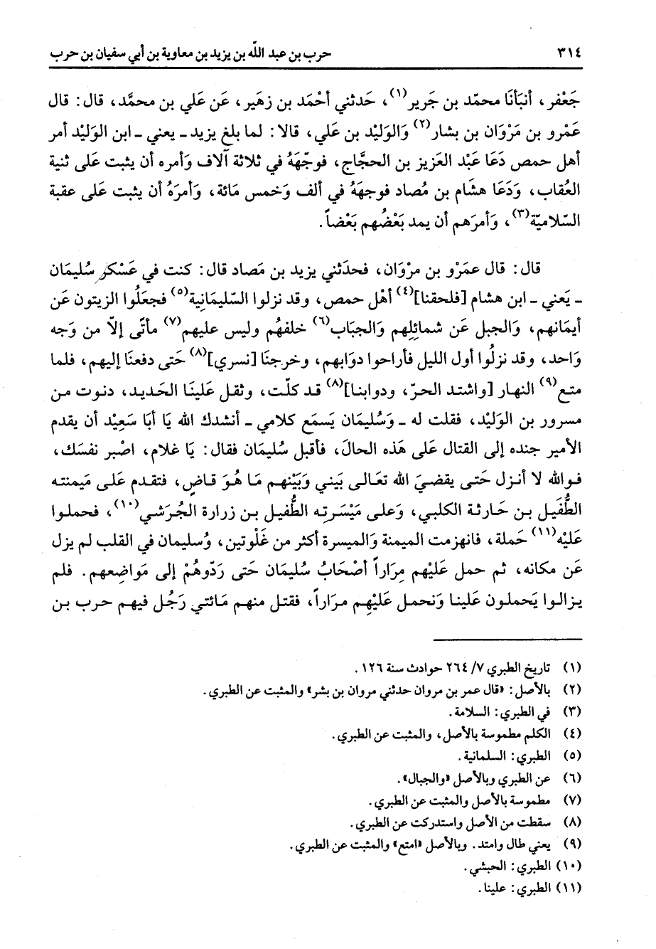 جعفر أنبأنا محمد بن جرير (1) حدثني أحمد بن زهير عن علي بن محمد قال قال عمرو بن مروان بن بشار (2) والوليد بن علي قالا لما بلغ يزيد يعني ابن الوليد أمر أهل حمص دعا عبد العزيز بن الحجاج فوجهه في ثلاثة آلاف وأمره أن يثبت على ثنية العقاب ودعا هشام بن مصاد فوجهه في ألف وخمس مائة وأمره أن يثبت على عقبة السلامية (3) وأمرهم أن يمد بعضهم بعضا قال قال عمرو بن مروان فحدثني يزيد بن مصاد قال كنت في عسكر سليمان يعني ابن هشام فلحقنا (4) أهل حمص وقد نزلوا السليمانية (5) فجعلوا الزيتون عن ايمانهم والجبل عن شمائلهم والجباب (6) خلفهم وليس عليهم (7) مأتى إلا من وجه واحد وقد نزلوا أول الليل فأراحوا دوابهم وخرجنا نسري (8) حتى دفعنا إليهم فلما متع (9) النهار واشتد الحرب ودوابنا (8) قد كلت وثقل علينا الحديد دنوت من مسرور بن الوليد فقلت له وسليمان يسمع كلامي انشدك الله يا أبا سعيد أن يقدم الأمير جنده إلى القتال على هذه الحال فأقبل سليمان فقال يا غلام اصبر نفسك فو الله لا انرل حتى يقضي الله تعالى بيني وبينهم ما هو قاض فتقدم على ميمنته الطفيل بن حارثة الكلبي وعلى ميسرته الطفيل بن زرارة الجرشي (10) فحملوا عليه (11) حملة فانهزمت الميمنة والميسرة اكثر من غلوتين وسليمان في القلب لم يزل عن مكانه ثم حمل عليهم مرارا أصحاب سليمان حتى ردوهم إلى مواضعهم فلم يزالوا يحملون علينا ونحمل عليهم مرارا فقتل منهم مائتي رجل فيهم حرب بن