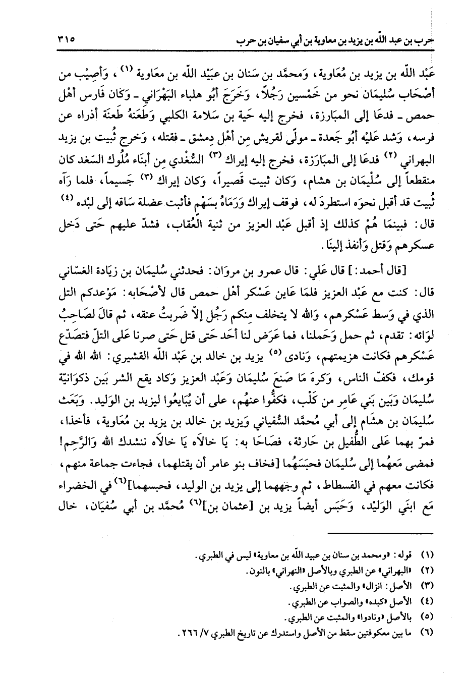عبد الله بن يزيد بن معاوية ومحمد بن سنان بن عبيد الله بن معاوية (1) وأصيب من أصحاب سليمان نحو من خمسين رجلا وخرج أبو هلباء البهراني وكان فارس أهل حمص فدعا إلى المبارزة فخرج إليه حية بن سلامة الكلبي وطعنه طعنة اذراه عن فرسه وشد عليه أبو جعدة مولى لقريش من أهل دمشق فقتله وخرج ثبيت بن يزيد البهراني (2) فدعا إلى المبارزة فخرج إليه ايراك (3) السغدي من أبناء ملوك السغد كان منقطعا إلى سليمان بن هشام وكان ثبيت قصيرا وكان ايراك (3) جسيما فلما رآه ثبيت قد أقبل نحوه استطرد له فوقف ايراك ورماه بسهم فأثبت عضلة ساقه إلى لبده (4) قال فبينما هم كذلك إذ اقبل عبد العزيز هن ثنية العقاب فشد عليهم حتى دخل عسكرهم وقتل وانفذ إلينا قال أحمد قال علي قال عمرو بن مروان فحدثني سليمان بن زيادة الغساني قال كنت مع عبد العزيز فلما عاين عسكر أهل حمص قال لأصحابه موعدكم التل الذي في وسط عسكرهم والله لا يتخلف منكم رجل إلا ضربت عنقه ثم قال لصاحب لوائه تقدم ثم حمل وحملنا فما عرض لنا أحد حتى قتل حتى صرنا على التل فتصدع عسكرهم فكانت هزيمتهم ونادى (5) يزيد بن خالد بن عبد الله القشيري الله الله في قومك فكف الناس وكره ما صنع سليمان وعبد العزيز وكاد يقع الشر بين ذكوانية سليمان وبين بني عامر من كلب فكفوا عنهم على أن يبايعوا ليزيد بن الوليد وبعث سليمان بن هشام إلى أبي محمد السفياني ويزيد بن خالد بن يزيد بن معاوية فأخذا فمر بهما على الطفيل بن حارثة فصاحا به يا خالاه ننشدك الله والرحم فمضى معهما إلى سليمان فحبسهما فخاف بنو عامر أن يقتلهما فجاءت جماعة منهم فكانت معهم في الفسطاط ثم وجههما إلى يزيد بن الوليد فحبسهما (6) في الخضراء مع ابني الوليد وحبس أيضا يزيد بن عثمان بن (6) محمد بن أبي سفيان خال