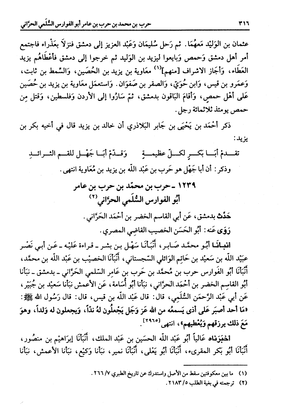 1239 - حرب بن محمد بن حرب بن عامر أبو الفوارس السلمي الحراني (2) حدث بدمشق عن أبي القاسم الخضر بن احمد الحراني روى عنه أبو الحسن الخصيب القاضي المصري أنبأنا أبو محمد صابر أنبأنا سهل بن بشر قراءة عليه عن أبي نصر عبيد الله بن سعيد بن حاتم الوائلي السجستاني أنبأنا الخصيب بن عبد الله بن محمد أنبأنا أبو الفوارس حرب بن محمد بن حرب بن عامر السلمي الحراني بدمشق نبأنا أبو القاسم الخضر بن احمد الحراني نبأنا أبو اسامة عن الاعمش نبأنا سعيد بن جبير عن أبي عبد الرحمن السلمي قال قال عبد الله بن قيس قال رسول الله صلى الله عليه وسلم ما أحد أحبر على اذى يسمعه من الله عز وجل يجعلون له ندا ويجعلون له ولدا وهو مع ذلك يرزقهم ويعطيهم انتهى
