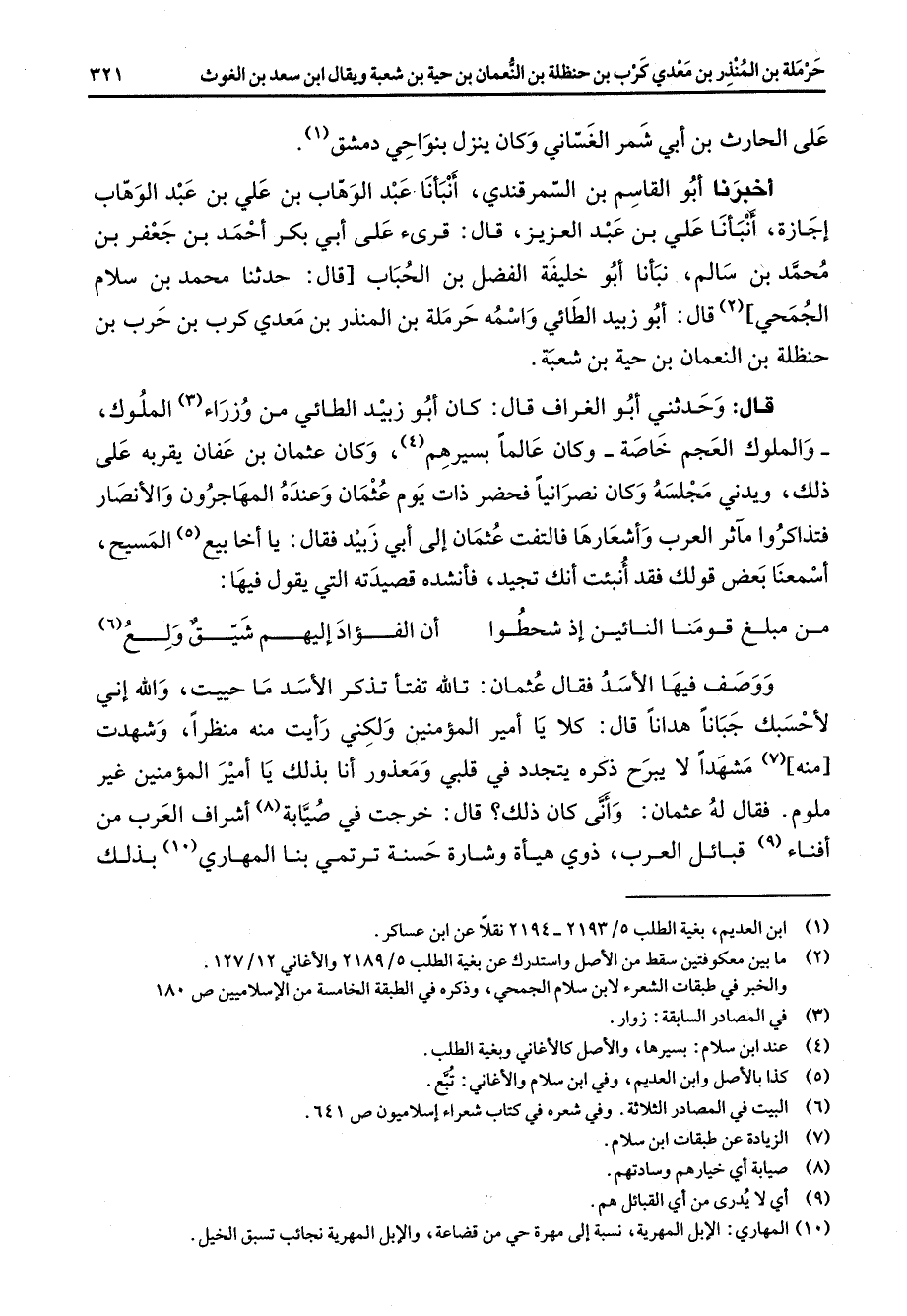اخبرنا أبو القاسم بن السمرقندي أنبأنا عبد الوهاب بن علي بن عبد الوهاب اجازة أنبأنا علي بن عبد العزيز قال قرئ على أبي بكر احمد بن جعفر بن محمد بن سالم نبأنا أبو خليفة الفضل بن الحباب قال حدثنا محمد بن سلام الجمحي (2) قال أبو زبيد الطائي واسمه حرملة بن المنذر بن معدي كرب بن حرب بن حنظلة بن النعمان بن حية بن شعبة قال وحدثني أبو الغراف قال كان أبو زبيد الطائي من وزراء (3) الملوك والملوك العجم خاصة وكان عالما بسيرهم (4) وكان عثمان بن عفان يقربه على ذلك ويدني مجلسه وكان نصرانيا فحضر ذات يوم عثمان وعنده المهاجرون والانصار فتذاكروا مآثر العرب وأشعارها فالتفت عثمان إلى أبي زبيد فقال يا أخا بيع (5) المسيح اسمعنا بعض قولك فقد أنبئت انك تجيد فانشده قصيدته التي يقول فيها من مبلغ قومنا النائين إذ شحطوا * أن الفؤاد إليهم شيق ولع (6) ووصف فيها الأسد فقال عثمان تالله تفتأ تذكر الأسد ما حييت والله أني لاحسبك جبانا هدانا قال كلا يا أمير المؤمنين ولكن رأيت منه منظرا وشهدت منه (7) مشهدا لا يبرح ذكره يتجدد في قلبي ومعذور أنا بذلك يا أمير المؤمنين غير ملوم فقال له عثمان وأنى كان ذلك قال خرجت في صيابة (8) اشراف العرب من أفناء (9) قبائل العرب ذوي هيأة وشارة حسنة ترتمي بنا المهاري (10) بذلك