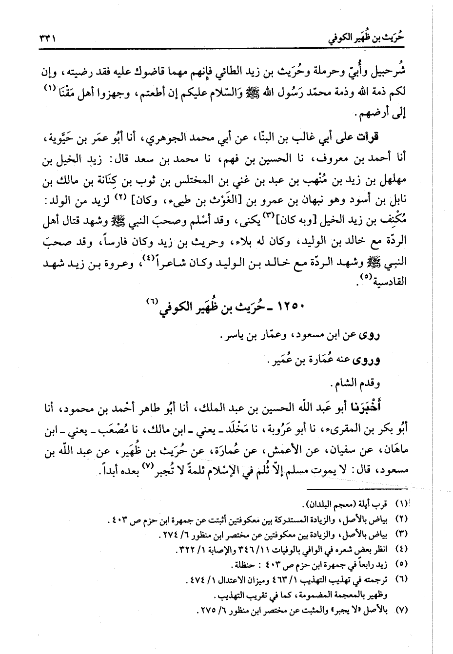 1250 - حريث بن ظهير الكوفي (6) روى عن ابن مسعود عمار بن ياسر وروى عنه عمارة بن عمير وقدم الشام أخبرنا أبو عبد الله الحسين بن عبد الملك أنا أبو طاهر احمد بن محمود أنا أبو بكر بن المقرئ نا أبو عروبة نا مخلد يعني ابن مالك نا مصعب يعني ابن ماهان عن سفيان عن الاعمش عن عمارة عن حريث بن ظهير عن عبد الله بن مسعود قال لا يموت مسلم إلا ثلم في الإسلام ثلمة لا تجبر (7) بعده أبدا