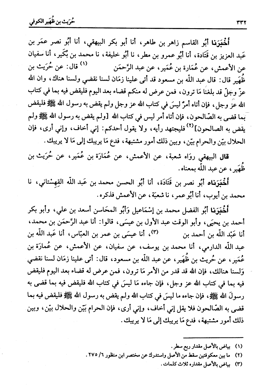 اخبرنا أبو القاسم زاهر بن طاهر أنا أبو بكر البيهقي أنا أبو نصر عمر بن عبد العزيز بن قتادة أنا أبو عمرو بن مطر نا أبو خليفة نا محمد بن بكير أنا سفيان عن الاعمش عن عمارة بن عمير عن عبد الرحمن (1) قال عن حريث بن ظهير قال قال عبد الله بن مسعود قد أتى علينا زمان لسنا نقضي ولسنا هناك وان الله عز وجل قد بلغنا ما ترون فمن عرض له منكم قضاء بعد اليوم فليقض فيه بما في كتاب الله عز وجل فإن أتاه أمر ليس في كتاب الله عز وجل ولم يقض به رسول الله صلى الله عليه وسلم فليقض بما قضى به الصالحون فإن أتاه أمر ليس في كتاب الله ولم يقض به رسول الله صلى الله عليه وسلم ولم يقض به الصالحون (2) فليجتهد رأيه ولا يقول احدكم أني أخاف واني أرى فإن الحلال بين والحرام بين وبين ذلك أمور مشتبهة فدع ما يريبك إلى ما لا يريبك قال البيهقي رواه شعبة عن الاعمش عن عمارة بن عمير عن حريث بن ظهير عن عبد الله بمعناه اخبرناه أبو نصر بن قتادة أنا أبو الحسن محمد بن عبد الله القهستاني نا محمد بن ايوب أنا أبو عمر نا شعبة عن الاعمش فذكره اخبرنا أبو الفضل محمد بن اسماعيل وأبو المحاسن اسعد بن علي وأبو بكر احمد بن يحيى وأبو الوقت عبد الأول بن عيسى قالوا أنا عبد الرحمن بن محمد أنا عبد الله بن احمد بن (3) أنا عيسى بن عمر بن العباس أنا عبد الله بن عبد الله الدارمي أنا محمد بن يوسف عن سفيان عن الاعمش عن عمارة بن عمير عن حريث بن ظهير عن عبد الله بن مسعود قال أتى علينا زمان لسنا نقضي ولسنا هنالك فإن الله قد قدر من الأمر ما ترون فمن عرض له قضاء بعد اليوم فليقض فيه بما في كتاب الله عز وجل فإن جاءه ما ليس في كتاب الله فليقض فيه بما قضى به رسول الله صلى الله عليه وسلم فإن جاءه ما ليس في كتاب الله ولم يقض به رسول الله صلى الله عليه وسلم فليقض فيه بما قضى به الصالحون فلا يقل إني أخاف وإني أرى فإن الحرام بين والحلال بين وبين ذلك أمور مشتبهة فدع ما يريبك إلى ما لا يريبك