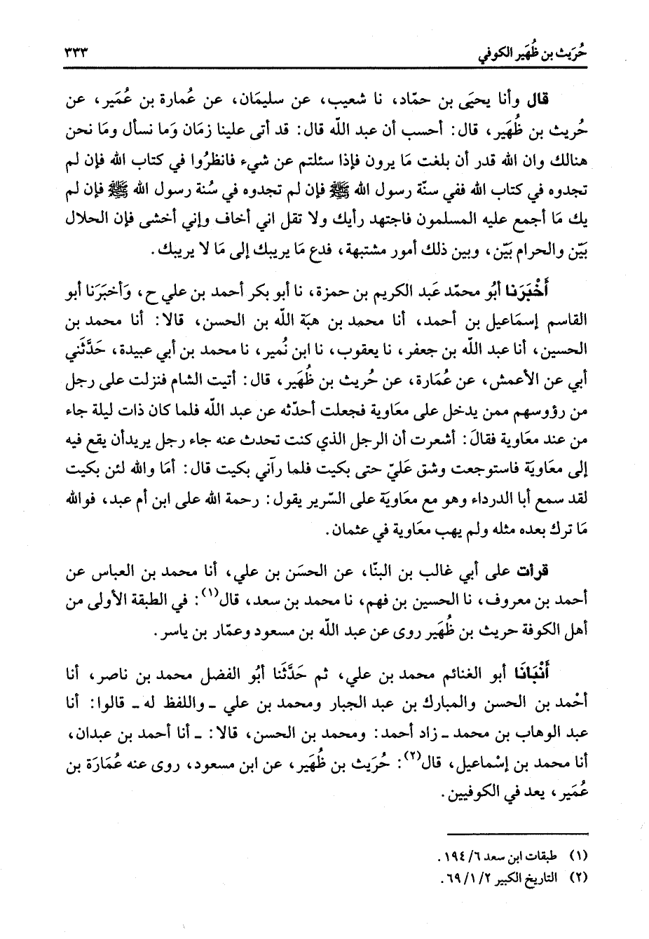 قال وأنا يحيى بن حماد نا شعيب عن سليمان عن عمارة بن عمير عن حريث بن ظهير قال احسب أن عبد الله قال قد أتى علينا زمان وما نسأل وما نحن هنالك وان الله قدر أن بلغت ما يرون فإذا سئلتم عن شئ فانظروا في كتاب الله فإن لم تجدوه في كتاب الله ففي سنة رسول الله صلى الله عليه وسلم فإن لم تجدوه في سنة رسول الله صلى الله عليه وسلم فإن لم يك ما اجمع عليه المسلمون فاجتهد رأيك ولا تقل إني أخاف وإني أخشى فإن الحلال بين والحرام بين وبين بذلك أمور مشتبهة فدع ما يريبك إلى ما لا يريبك أخبرنا أبو محمد عبد الكريم بن حمزة نا أبو بكر احمد بن علي وأخبرنا أبو القاسم اسماعيل بن احمد أنا محمد بن هبة الله بن الحسن قالا أنا محمد بن الحسين أنا عبد الله بن جعفر نا يعقوب نا ابن نمير نا محمد بن أبي عبيدة حدثني أبي عن الاعمش عن عمارة عن حريث بن ظهير قال أتيت الشام فنزلت على رجل م رؤوسهم ممن يدخل على معاوية فجعلت أحدثه عن عبد الله فلما كان ذات ليلة جاء من عند معاوية فقال اشعرت أن الرجل الذي كنت تحدث عنه جاء رجل يريد أن يقع فيه إلى معاوية فاستوجعت وشق علي حتى بكيت فلما رآني بكيت قال أما والله لئن بكيت لقد سمع أبا الدرداء وهو مع معاوية على السرير يقول رحمة الله على ابن أم عبد فوالله ما ترك بعده مثله ولم يهب معاوية في عثمان قرأت على أبي غالب بن البنا عن الحسن بن علي أنا محمد بن العباس عن احمد بن معروف نا الحسين بن فهم نا محمد بن سعد قال (1) في الطبقة الأولى من أهل الكوفة حريث بن ظهير روى عن عبد الله بن مسعود وعمار بن ياسر أنبأنا أبو الغنائم محمد بن علي ثم حدثنا أبو الفضل محمد بن ناصر أنا احمد بن الحسن والمبارك بن عبد الجبار ومحمد بن علي واللفظ له قالوا أنا عبد الوهاب بن محمد زاد احمد ومحمد بن الحسن قالا أنا احمد بن عبدان أنا محمد بن اسماعيل قال (2) حريث بن ظهير عن ابن مسعود روى عنه عمارة بن عمير يعد في الكوفيين