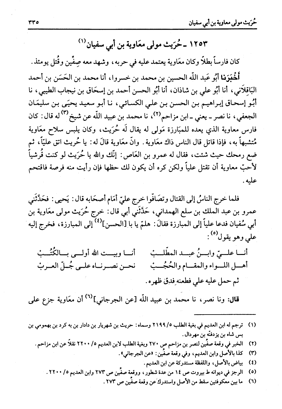 1253 - حريث مولى معاوية بن أبي سفيان (1) كان فارسا بطلا وكان معاوية يعتمد عليه في حربه وشهد معه صفين وقتل يومئذ أخبرنا أبو عبد الله الحسين بن محمد بن خسروا أنا محمد بن الحسن بن احمد الباقلاني أنا أبو علي بن شاذان أنا أبو الحسن احمد بن اسحاق بن نيجاب الطيبي نا أبو اسحاق إبراهيم بن الحسن بن علي الكسائي نا أبو سعيد يحيى بن سليمان الجعفي نا نصر يعني ابن مزاحم (2) نا محمد بن عبيد الله عن شيخ (3) له قال كان فارس معاوية الذي يعده للمبارزة مولى له يقال له حريث وكان يلبس سلاح معاوية متشبها به فإذا قاتل قال الناس ذاك معاوية وان معاوية قال له يا حريث اتق عليا ثم ضع رمحك حيث شئت فقال له عمرو بن العاص انك والله يا حريث لو كنت قرشيا لاحب معاوية أن تقتل عليا ولكن كره أن يكون لك حظها فإن رأيت منه فرصة فاقتحم عليه فلما خرج الناس إلى القتال وتصافوا خرج علي امام اصحابه قال يحيى فحدثني عمرو بن عبد الملك بن سلع الهمداني حدثني أبي قال خرج حريث مولى معاوية بن أبي سفيان فدعا عليا إلى المبارزة فقال هلم يا با الحسن (4) إلى المبارزة فخرج إليه علي وهو يقول * (5) أنا علي وابن عبد المطلب * أنا وبيت الله اولى بالكتب أهل اللواء والمقام والحجب * نحن نصرناه على جل العرب * ثم حمل عليه علي فطعنه فدق ظهره قال ونا نصر نا محمد بن عبيد الله عن الجرجاني (6) أن معاوية جزع على
