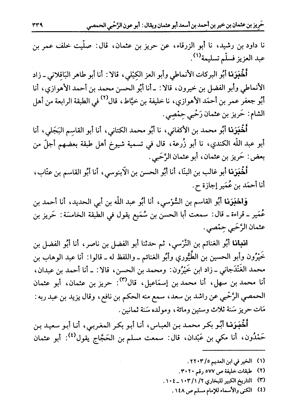 نا داود بن رشيد نا أبو الزرقاء عن حريز بن عثمان قال صليت خلف عمر بن عبد العزيز فسلم تسليمة (1) اخبرنا أبو البركات الانماطي وابو العز الكيلي قالا أنا أبو طاهر الباقلاني زاد الانماطي وابو الفضل بن خيرون قالا أنا أبو الحسن محمد بن احمد الاهوازي أنا أبو جعفر عم بن احمد الاهوازي نا خليفة بن خياط قال (2) في الطبقة الرابعة من أهل الشام حريز بن عثمان رحبي حمصي اخبرنا أبو محمد بن الاكفاني نا أبو محمد الكتاني أنا أبو القاسم البجلي أنا أبو عبد الله الكندي نا أبو زرعة قال في تسمية شيوخ أهل طبقة بعضهم اجل من بعض حريز بن عثمان أبو عثمان الرحبي أخبرنا أبو غالب بن البنا أنا أبو الحسن بن الابنوسي أنا أبو القاسم بن عتاب أنا احمد بن عميرة اجازة واخبرنا أبو القاسم بن السوسي أنا أبو عبد الله بن أبي الحديد أنا احمد بن عمير قراءة قال سمعت أبا الحسن بن سميع يقول في الطبقة الخامسة حريز بن عثمان الرحبي حمصي أنبأنا أبو الغنائم بن النرسي ثم حدثنا أبو الفضل بن ناصر أنا أبو الفضل بن خيرون وأبو الحسين بن الطيوري وأبو الغنائم واللفظ له قالوا أنا عبد الوهاب بن محمد الغندجاني زاد ابن خيرون ومحمد بن الحسن قالا أنا احمد بن عبدان أنا محمد بن سهل أنا محمد بن اسماعيل قال (3) حريز بن عثمان أبو عثمان الحمصي الرحبي عن راشد بن سعد سمع منه الحكم بن نافع وقال يزيد بن عبد ربه مات حريز سنة ثلاث وستين ومائة ومولده سنة ثمانين أخبرنا أبو بكر محمد بن العباس أنا أبو بكر المغربي أنا أبو سعيد بن حمدون أنا مكي بن عبدان قال سمعت مسلم بن الحجاج يقول (4) أبو عثمان