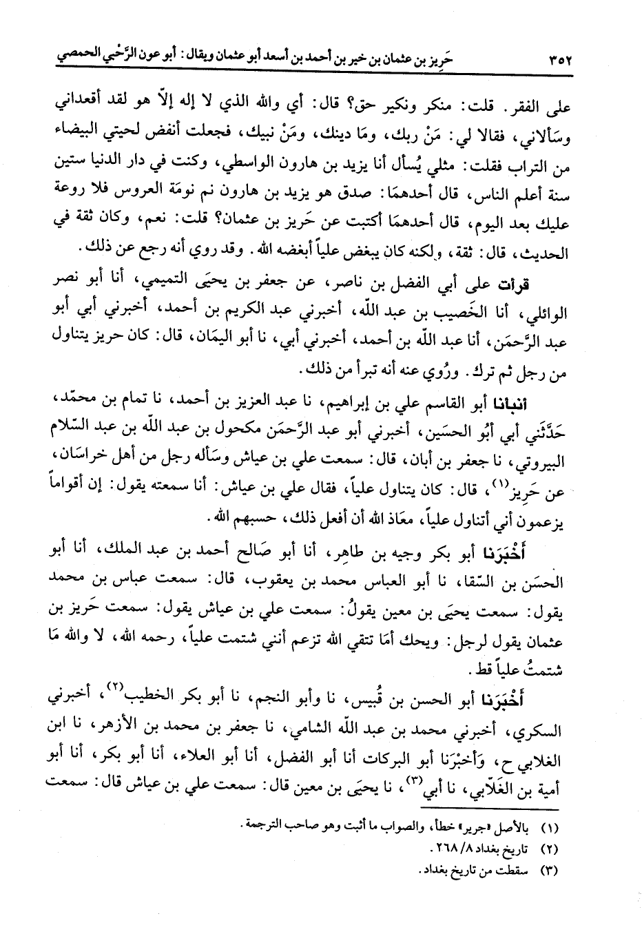 على الفقر قلت منكر ونكير حق قال أي والله الذي لا إله إلا هو لقد اقعداني وسألاني فقالا لي من ربك وما دينك ومن نبيك فجعلت أنفض لحيتي البيضاء من التراب فقلت مثلي يسأل أنا يزيد بن هارون الواسطي وكنت في دار الدنيا ستين سنة اعلم الناس قال أحدهما صدق هو يزيد بن هارون نم نومة العروس فلا روعة عليك بعد اليوم قال أحدهما اكتبت عن حريز بن عثمان قلت نعم وكان ثقة في الحديث قال ثقة ولكنه كان يبغض عليا ابغضه الله وقد روي انه رجع عن ذلك قرأت على أبي الفضل بن ناصر عن جعفر بن يحيى التميمي أنا أبو نصر الوائلي أنا الخصيب بن عبد الله اخبرني عبد الكريم بن احمد اخبرني أبي عبد الكريم بن احمد اخبرني أبي أبو عبد الرحمن أنا عبد الله بن احمد اخبرني أبي نا أبو اليمان قال كان حريز يتناول من رجل ثم ترك وروي عنه انه تبرأ من ذلك أنبأنا أبو القاسم علي بن إبراهيم نا عبد العزيز بن احمد نا تمام بن محمد حدثني أبي أبو الحسين اخبرني أبو عبد الرحمن مكحول بن عبد الله بن عبد السلام البيروتي نا جعفر بن ابان قال سمعت علي بن عياش وسأله رجل من أهل خراسان عن حريز (1) قال كان يتناول عليا فقال علي بن عياش أنا سمعته يقول أن اقواما يزعمون أني اتناول عليا معاذ الله أن افعل ذلك حسبهم الله أخبرنا أبو بكر وجيه بن طاهر أنا أبو صالح احمد بن عبد الملك أنا أبو الحسن بن السقا نا أبو العباس محمد بن يعقوب قال سمعت عباس بن محمد يقول سمعت يحيى بن معين يقول سمعت علي بن عياش يقول سمعت حريز بن عثمان يقول لرجل ويحك أما تتقي الله تزعم انني شتمت عليا رحمه الله لا والله ما شتمت عليا قط اخبرنا أبو الحسن بن قبيس نا وأبو النجم نا أبو بكر الخطيب (2) اخبرني السكري اخبرني محمد بن عبد الله الشامي نا جعفر بن محمد بن الازهر نا ابن الغلابي واخبرنا أبو البركات أنا أبو الفضل أنا أبو العلاء أنا أبو بكر أنا أبو أمية بن الغلابي نا أبي (3) نا يحيى بن معين قال سمعت علي بن عياش قال سمعت