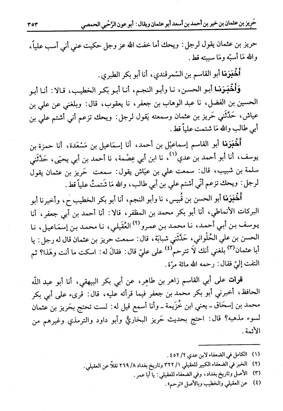 حريز بن عثمان يقول لرجل ويحك أما خفت الله عز وجل حكيت عني أني اسب عليا والله ما أسبه وما سببته قط اخبرنا أبو القاسم بن السمرقندي أنا أبو بكر الطبري وأخبرنا أبو الحسن نا وأبو النجم أنا أبو بكر الخطيب قالا أنا أبو الحسين بن الفضل نا عبد الوهاب بن جعفر نا يعقوب قال وبلغني عن علي بن عياش حدثني حريز بن عثمان وسمعته يقول لرجل ويحك تزعم أني اشتم علي بن أبي طالب والله ما شتمت عليا قط اخبرنا أبو القاسم إسماعيل بن احمد أنا إسماعيل بن مسعدة أنا حمزة بن يوسف أنا أبو احمد بن عدي (1) نا ابن أبي عصمة نا احمد بن أبي يحيى حدثني سلمة بن شبيب قال سمعت علي بن عياش يقول سمعت حريز بن عثمان يقول لرجل ويحك تزعم أني اشتم علي بن أبي طالب والله ما شتمت عليا قط أخبرني أبو الحسن بن قبيس نا وأبو النجم أنا أبو بكر الخطيب واخبرنا أبو البركات الانماطي أنا أبو بكر محمد بن المظفر قالا أنا احمد بن أبي جعفر أنا يوسف بن أبي احمد نا محمد بن عمرو (2) العقيلي نا محمد بن إسماعيل نا الحسن بن علي الحلواني حدثني شبابة قال سمعت حريز بن عثمان قال له رجل يا أبا عثمان (3) بلغني انك لا تترحم (4) على علي قال فقال له اسكت ما أنت وهذا ثم التفت الي فقال رحمه الله مائة مرة قرأت على أبي القاسم زاهر بن طاهر عن أبي بكر البيهقي أنا عبد الله الحافظ أخبرني أبو بكر محمد بن جعفر فيما قرأته عليه قال قرئ على أبي بكر محمد بن إسحاق يعني ابن خزيمة وأنا اسمع قيل له لست تحتج بحريز بن عثمان لسوء مذهبه قال احتج بحديث حريز البخاري وأبو داود والترمذي وغيرهم من الأئمة